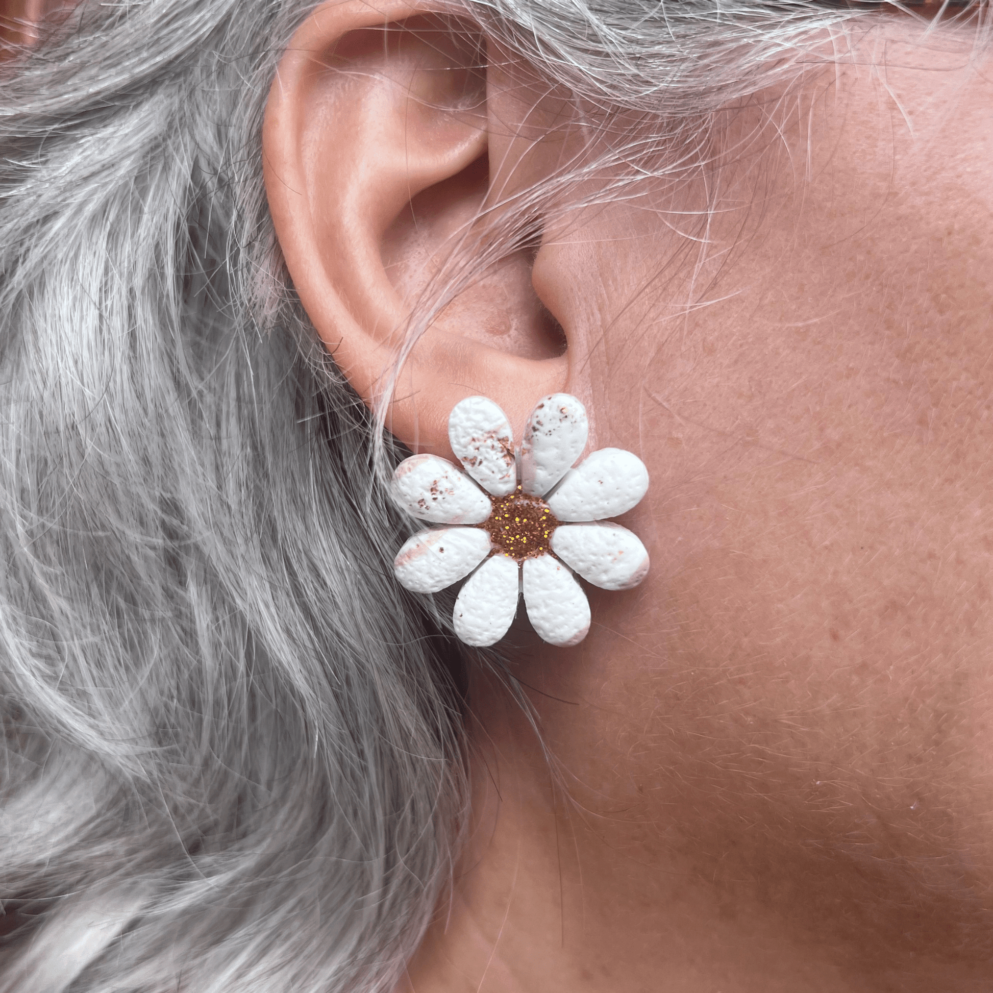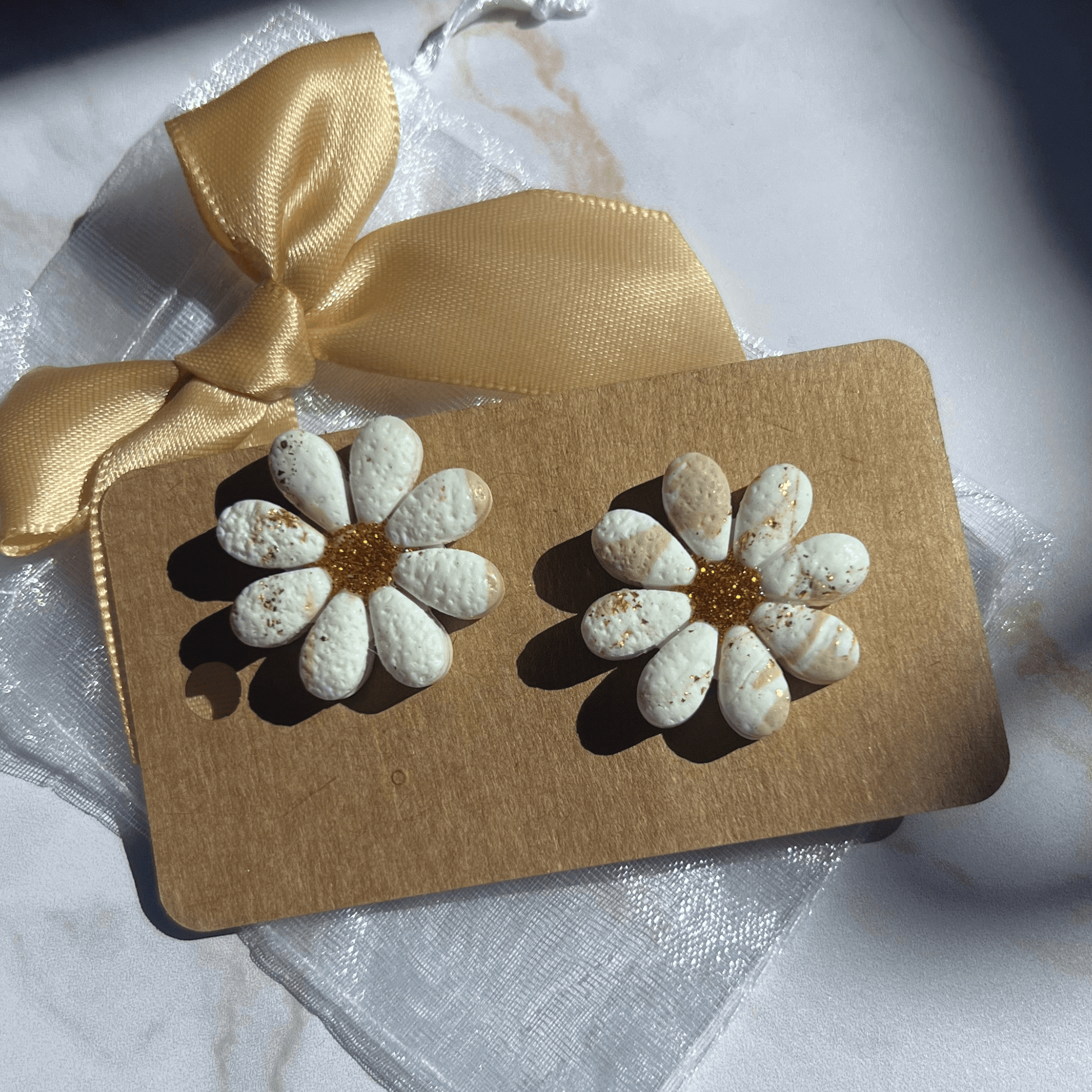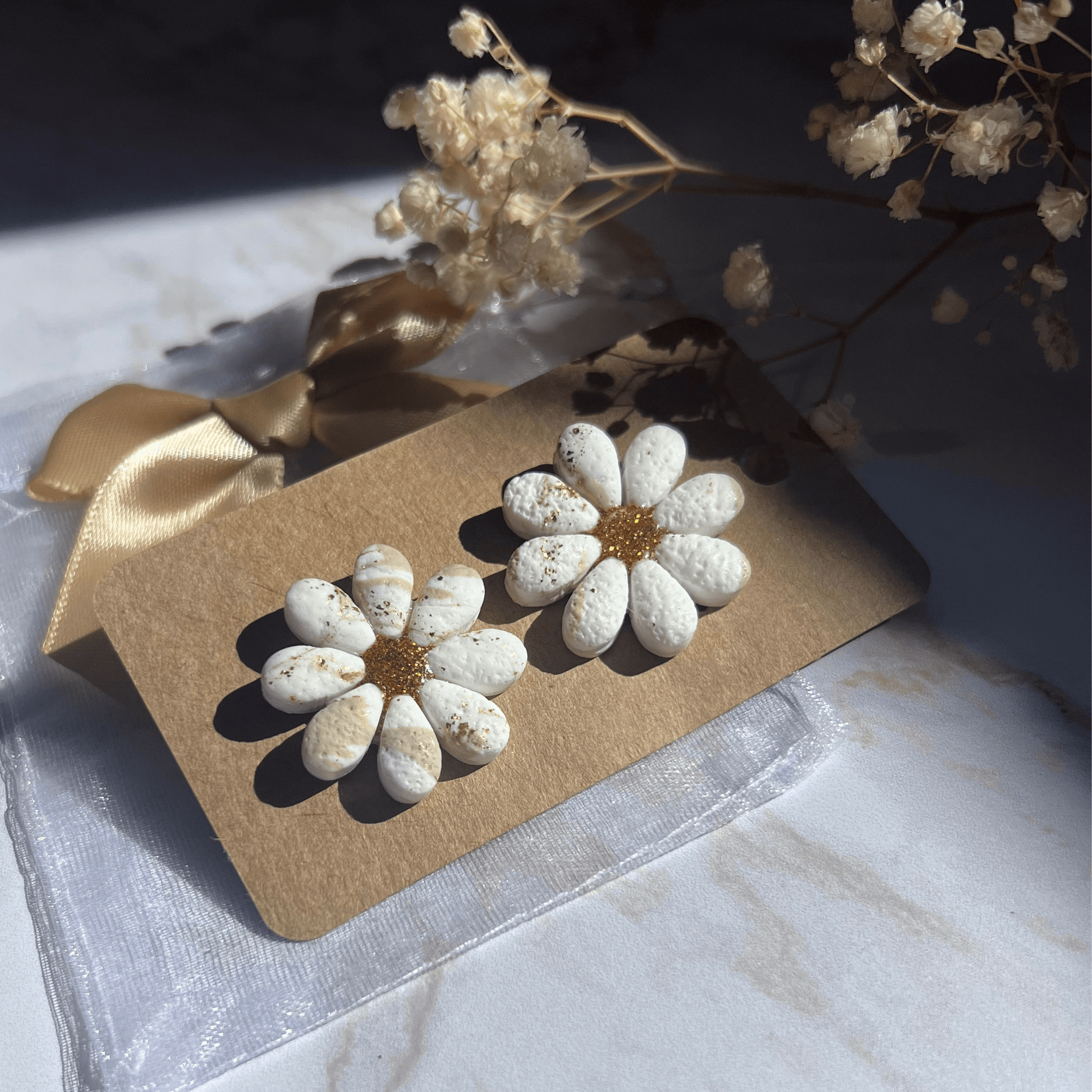 En forme de fleur texturée façon sable doré, marbré beige avec un cœur pistil en résine dorée pailletée, chaque paire est unique et délicate.