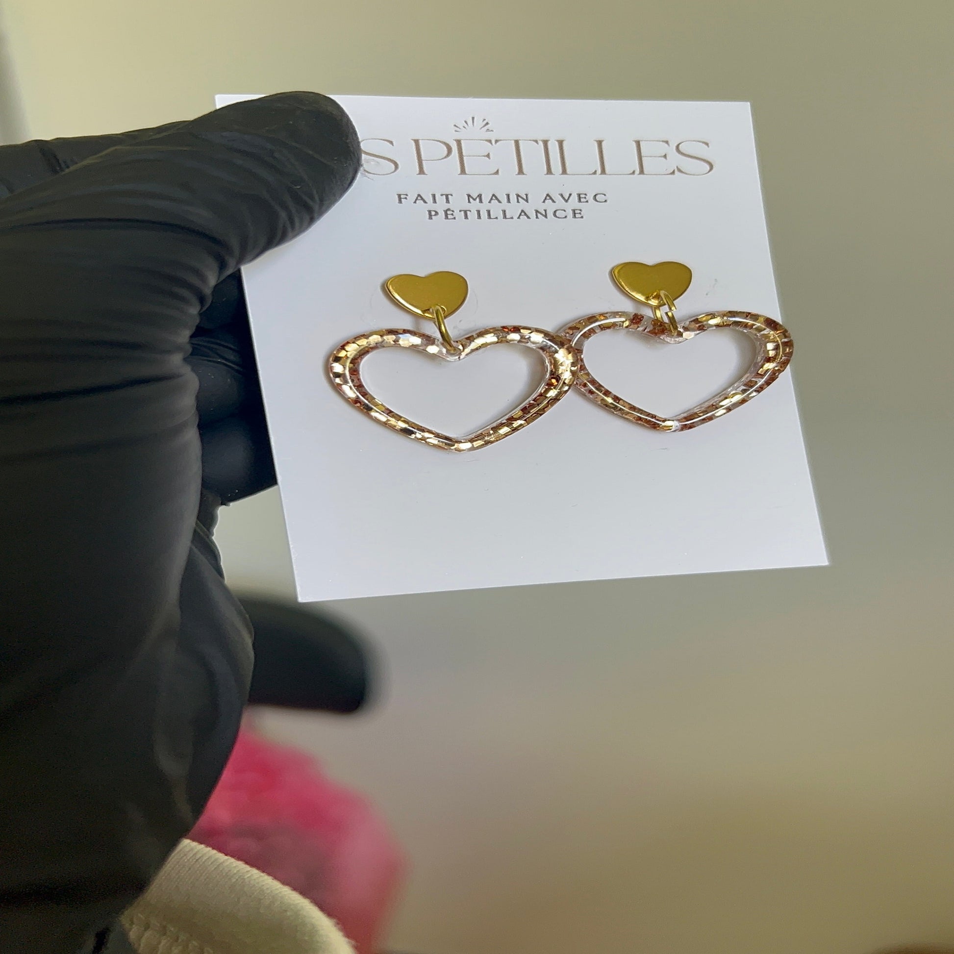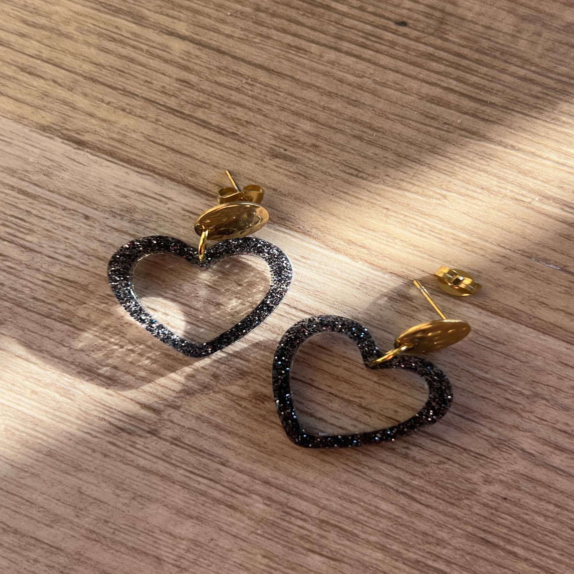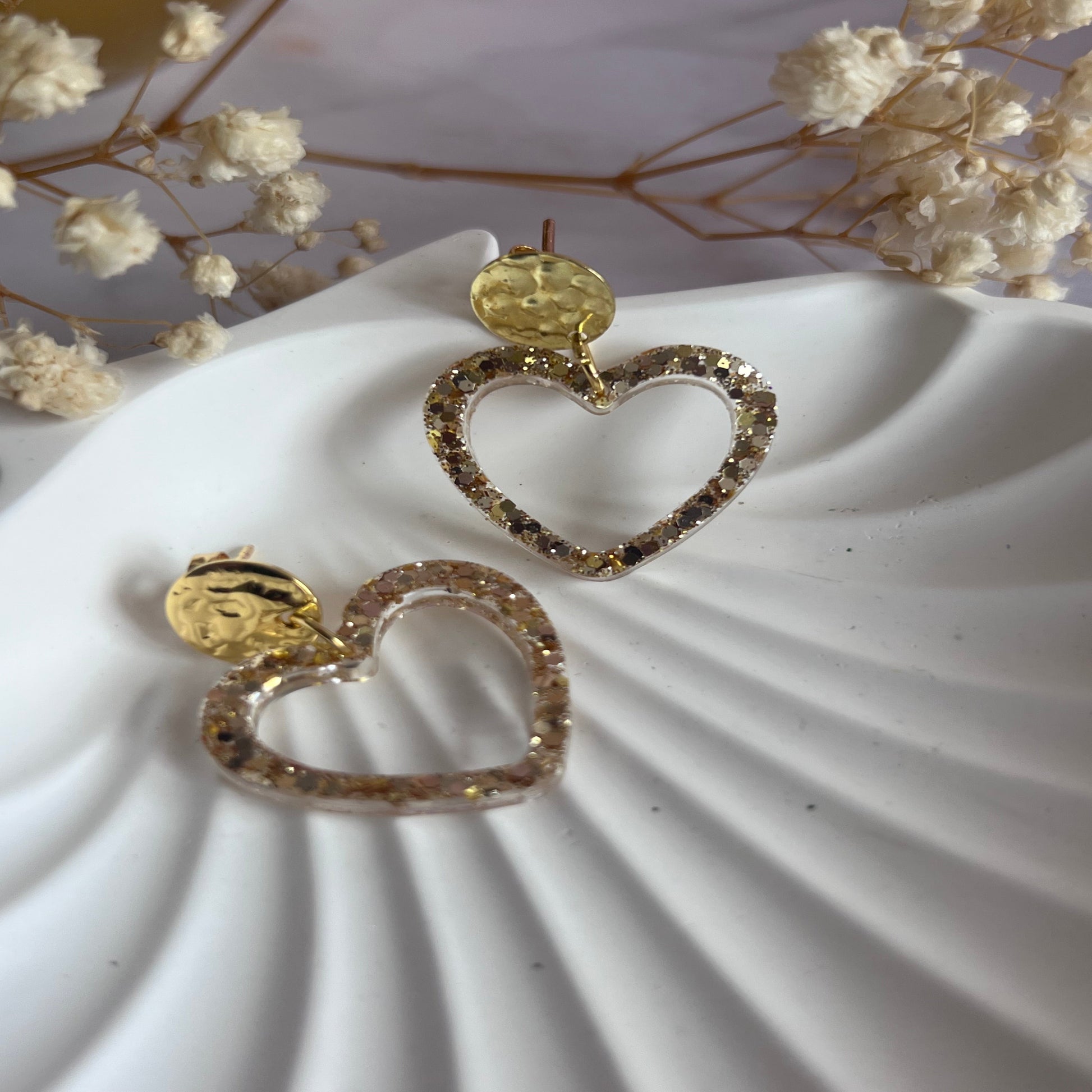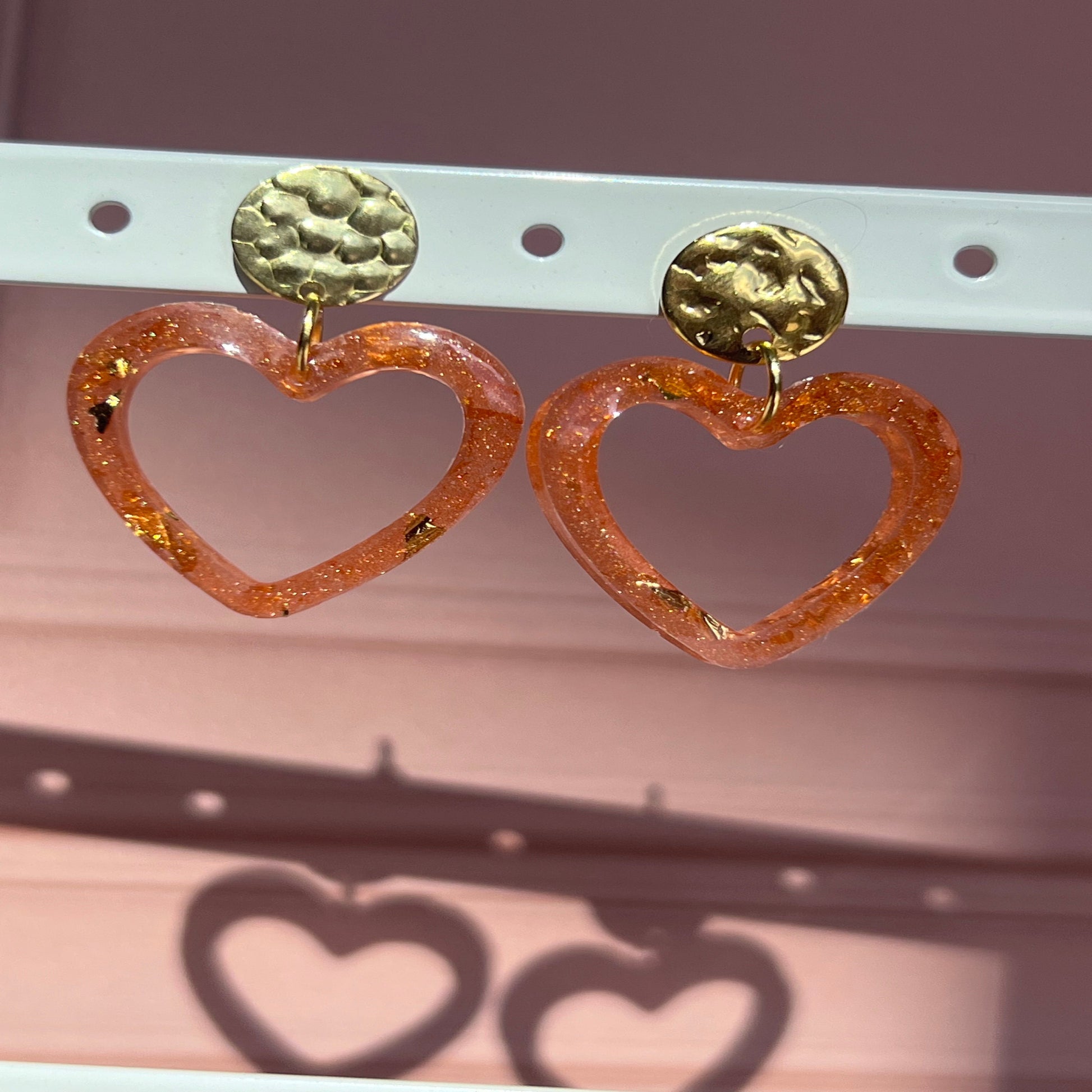 Boucles d'oreilles cœur paillettes en résine.