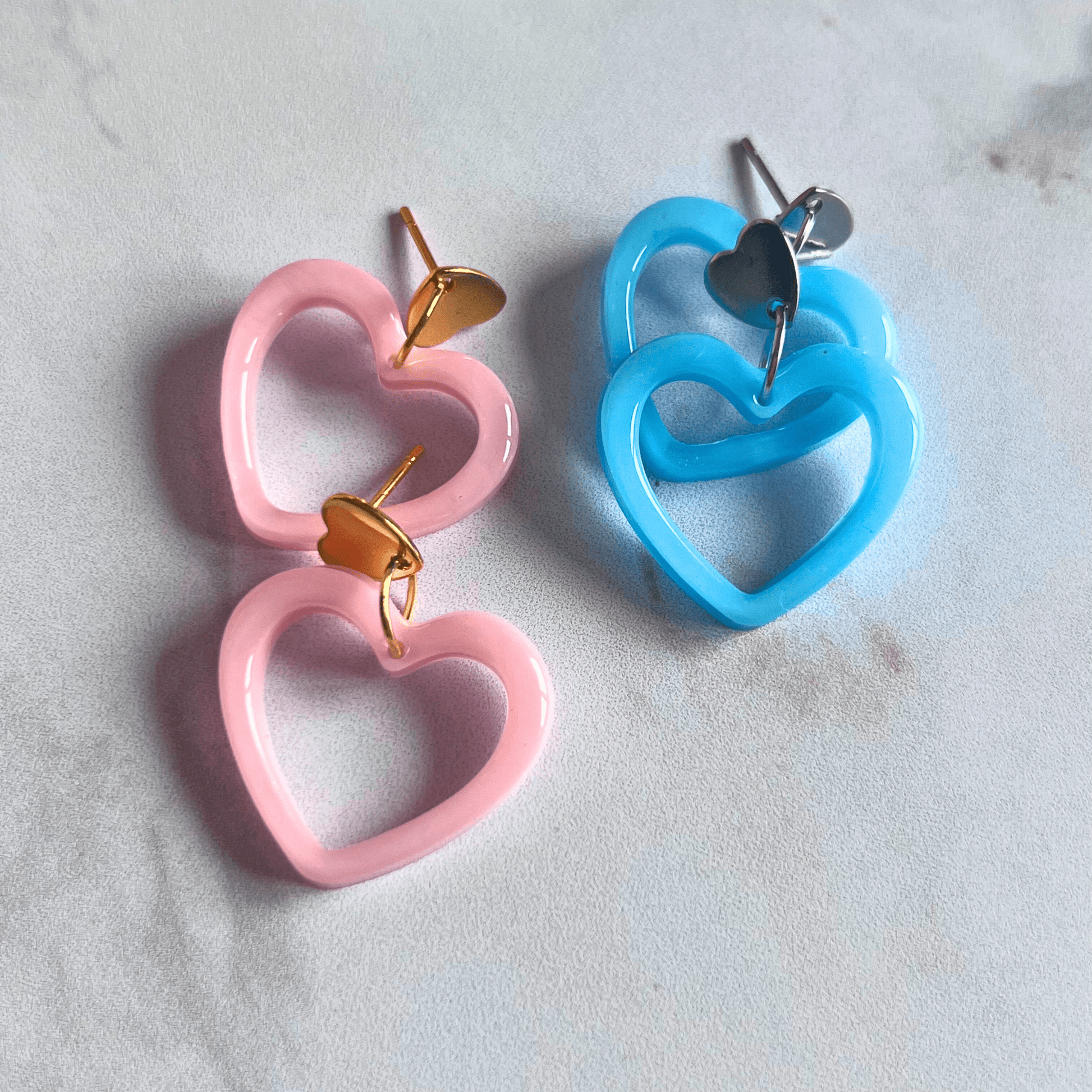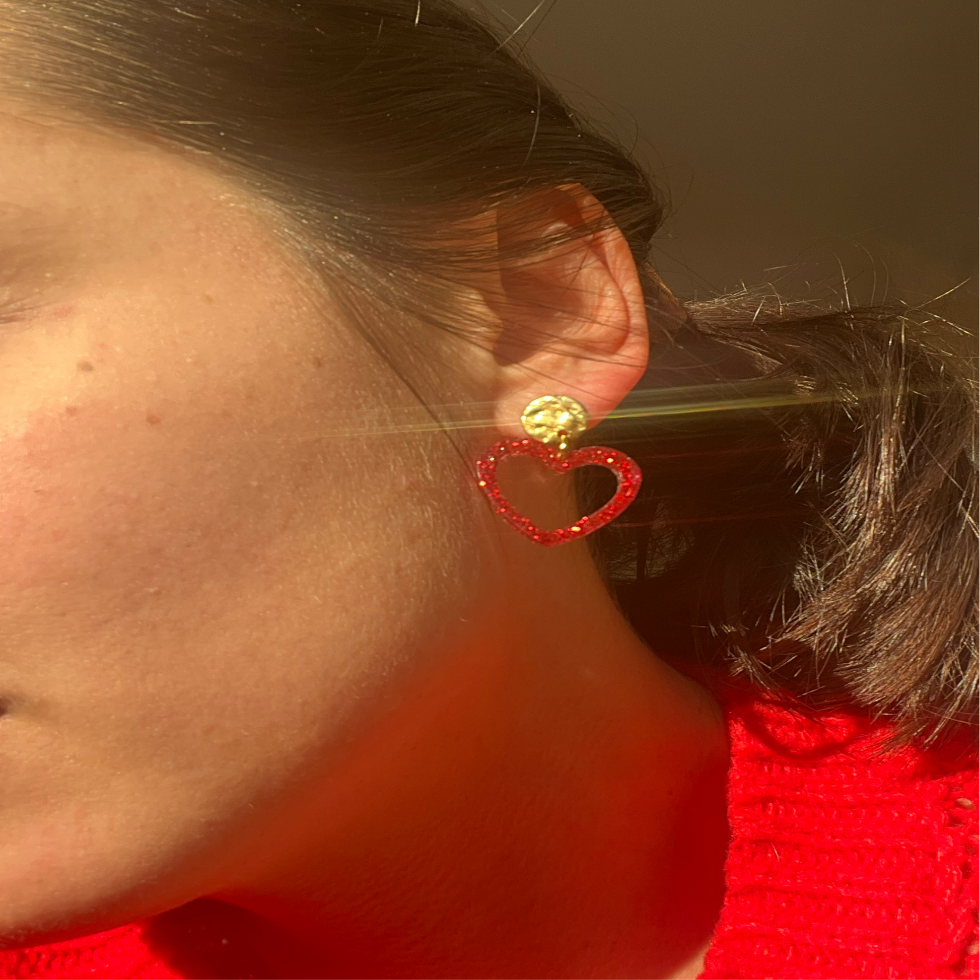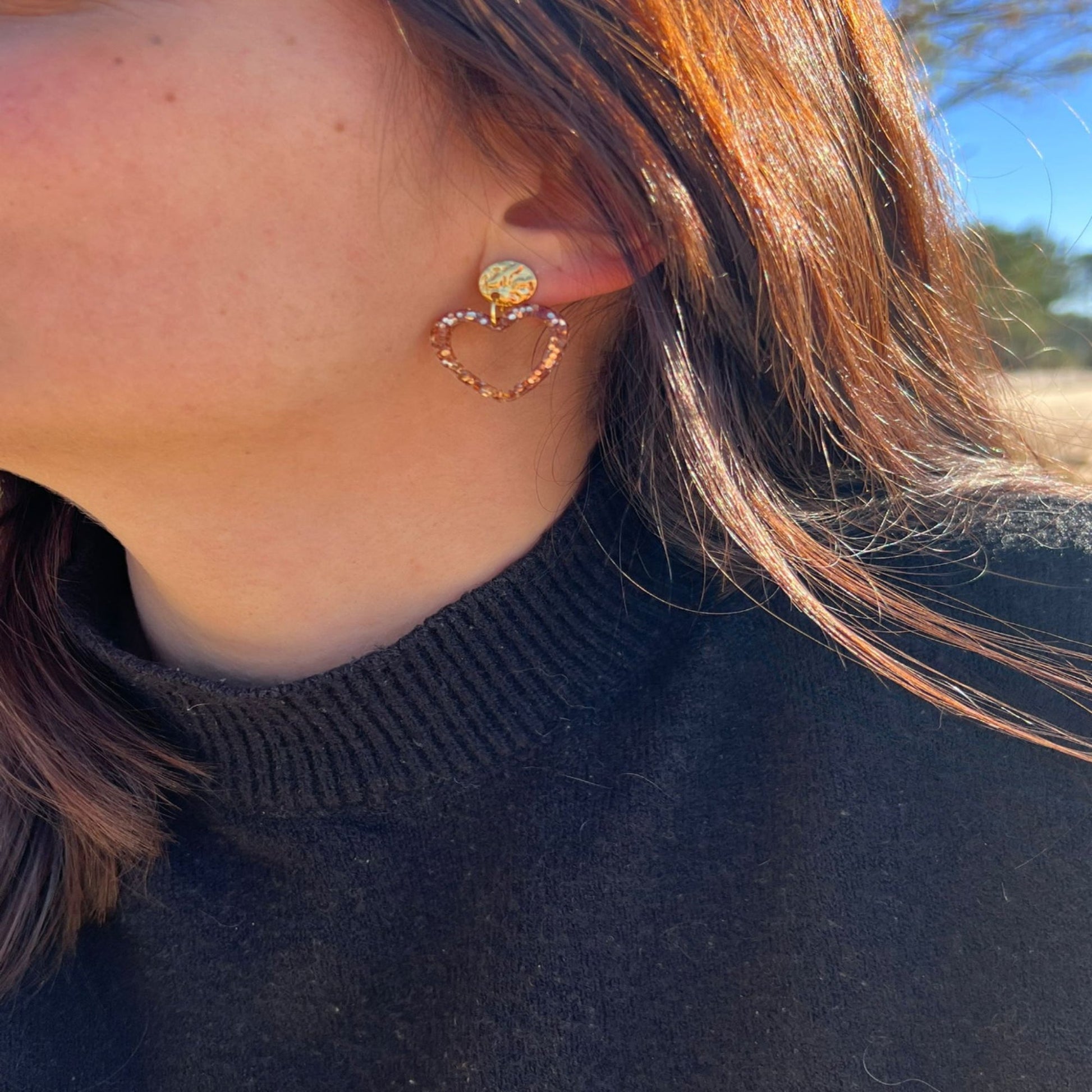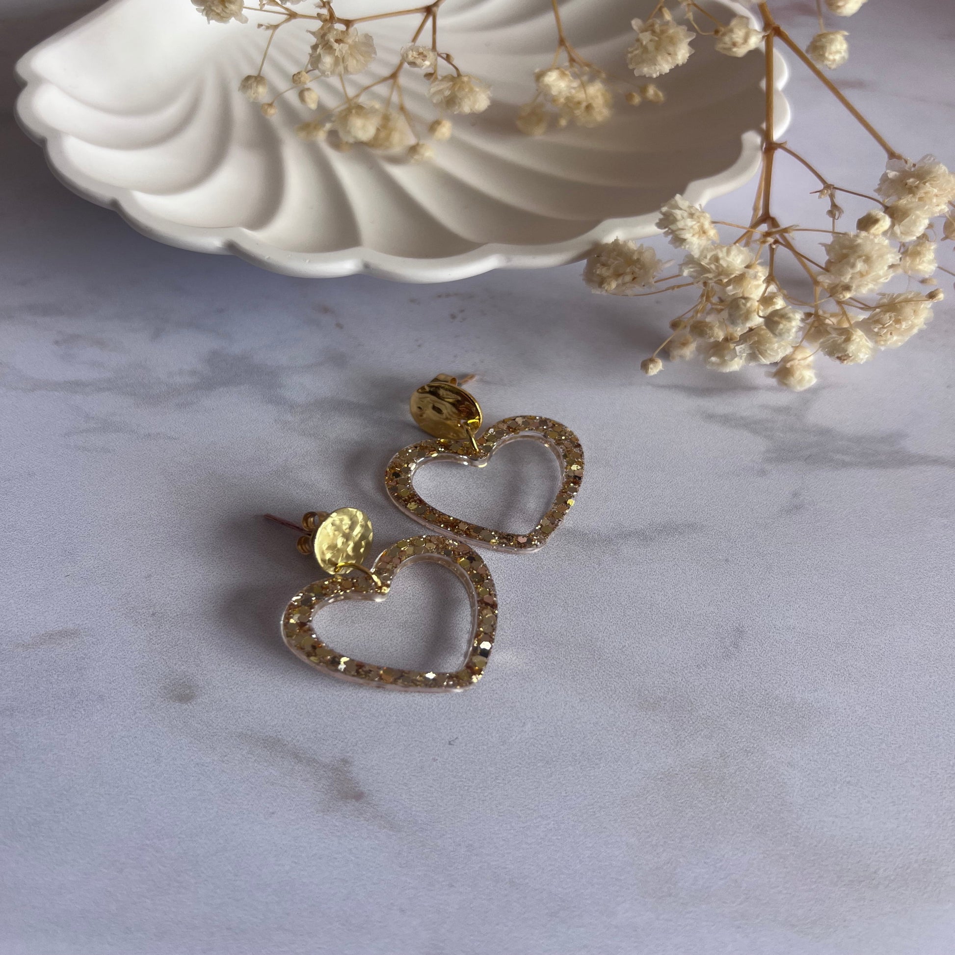 Boucles d'oreilles cœur paillettes en résine.