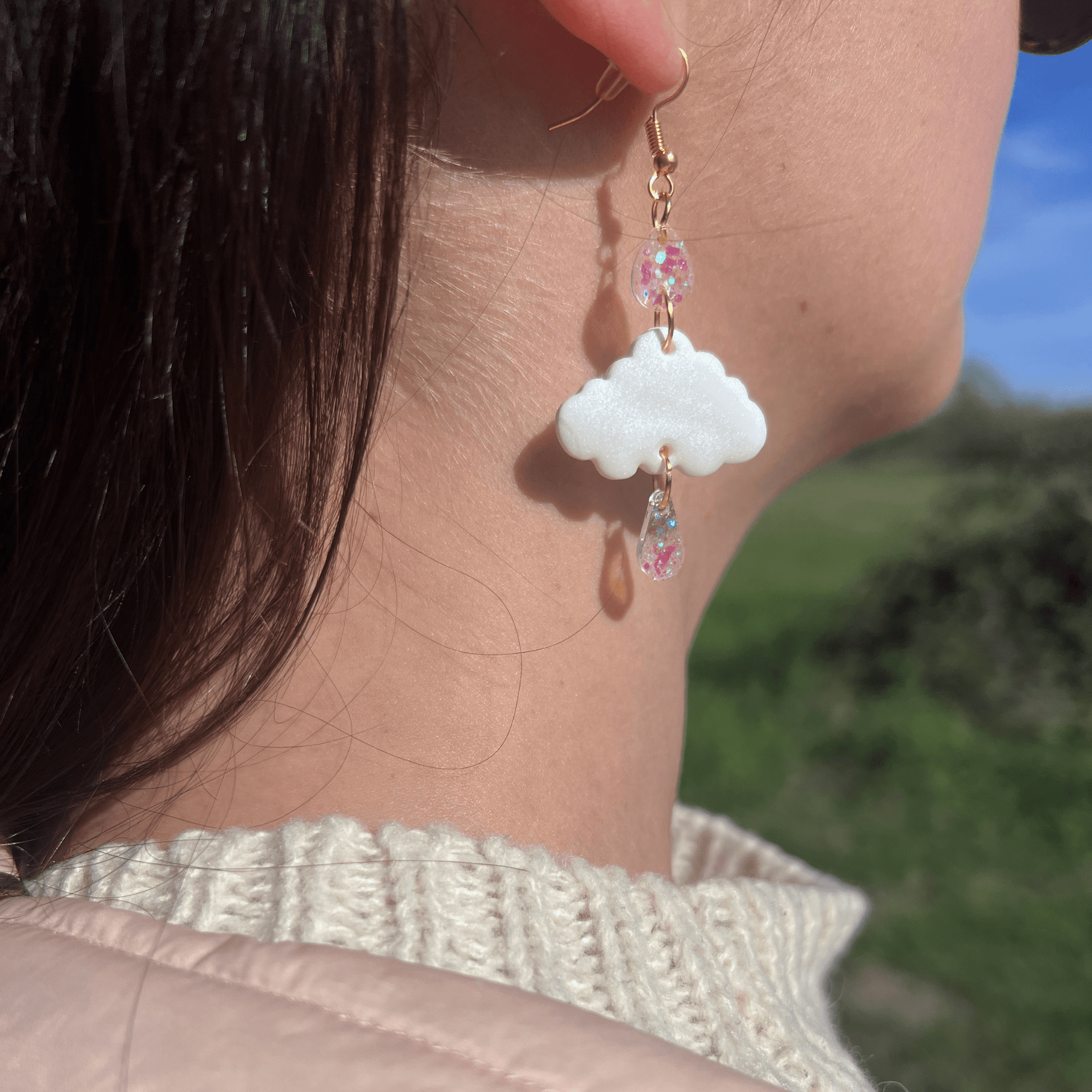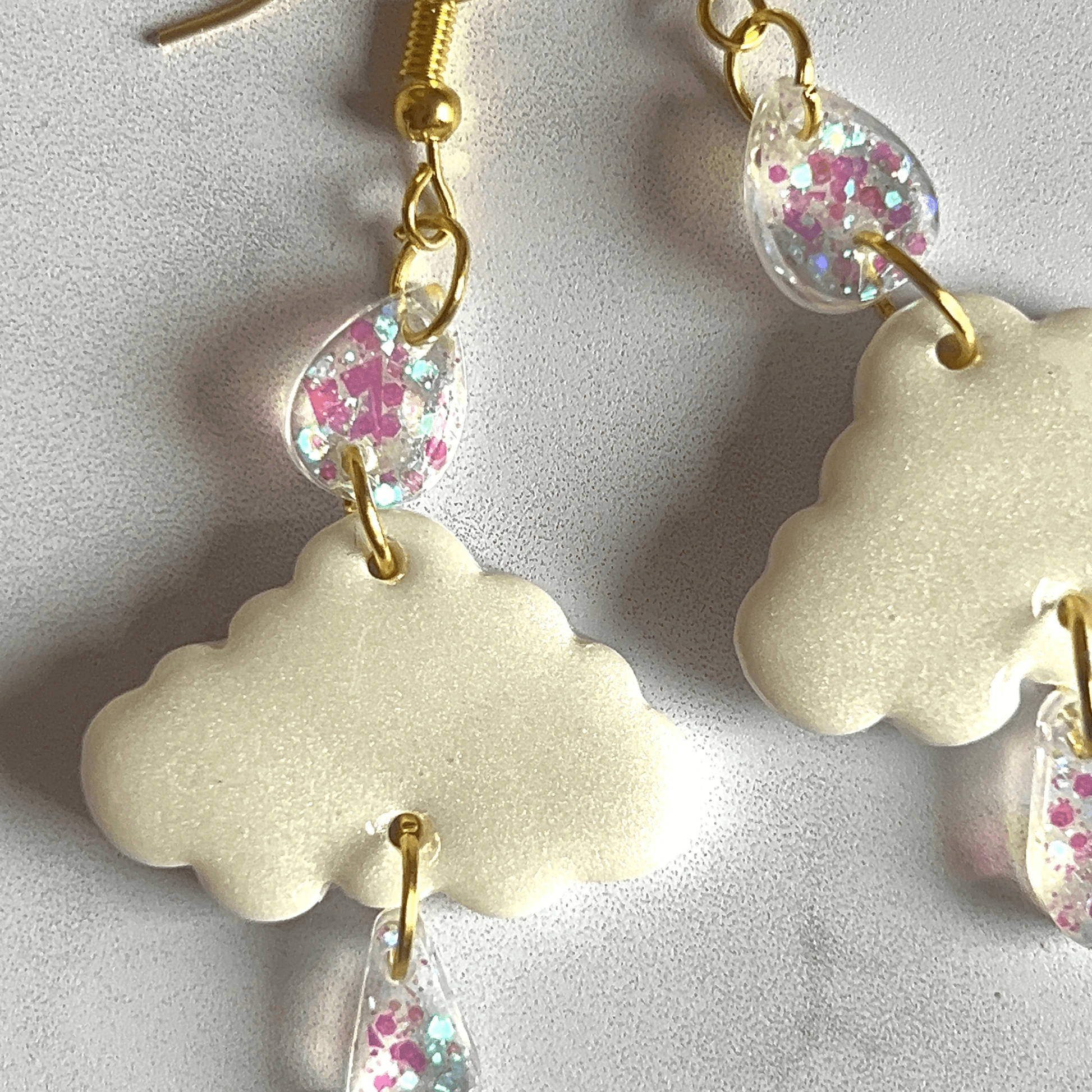 Entièrement faites à la main en pâte polymère nacrée, ces adorables nuages blancs laissent tomber de délicates gouttes scintillantes en résine, façon pluie de paillettes rose pastel holographique.
