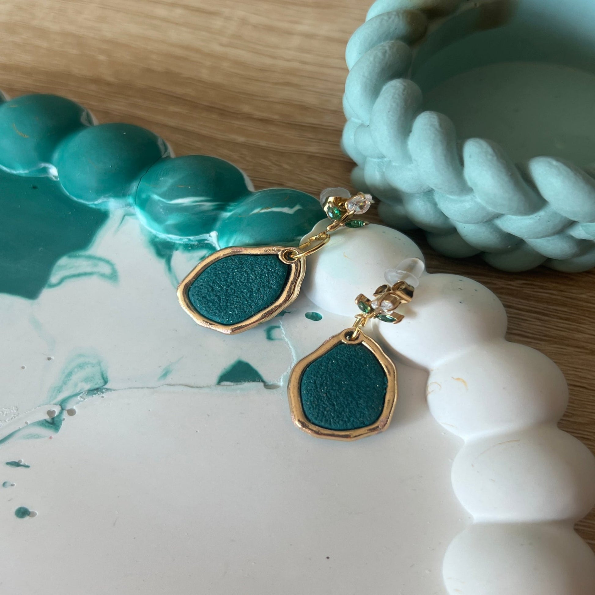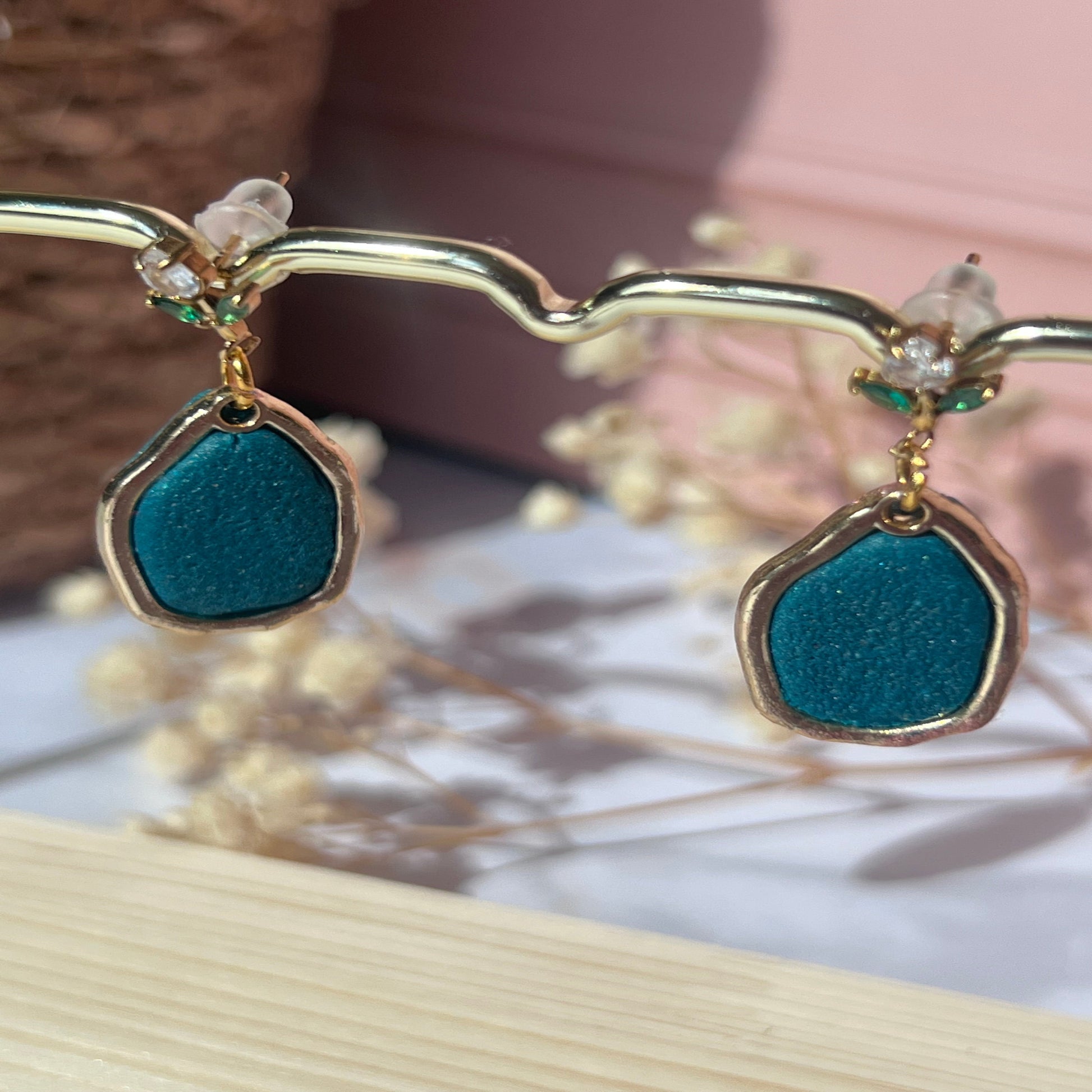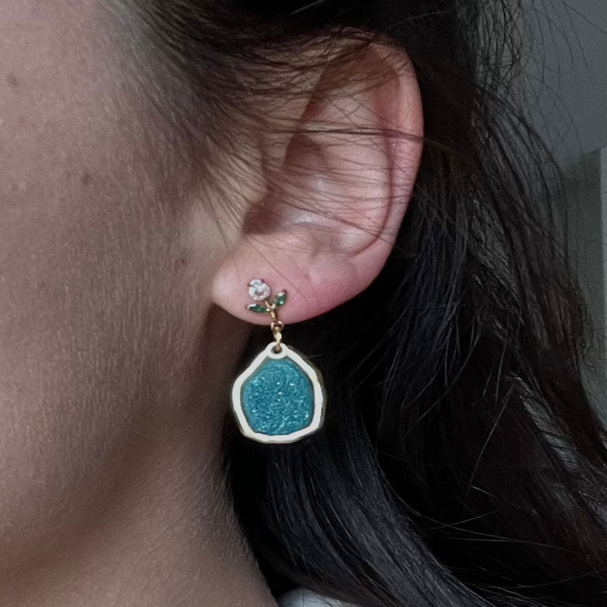 Assemblage en acier inoxydable doré, pâte polymère verte paillette texturée, orné d'un bijou tulipe. Elles sont très légères. Hauteur 2,4 cm environ.