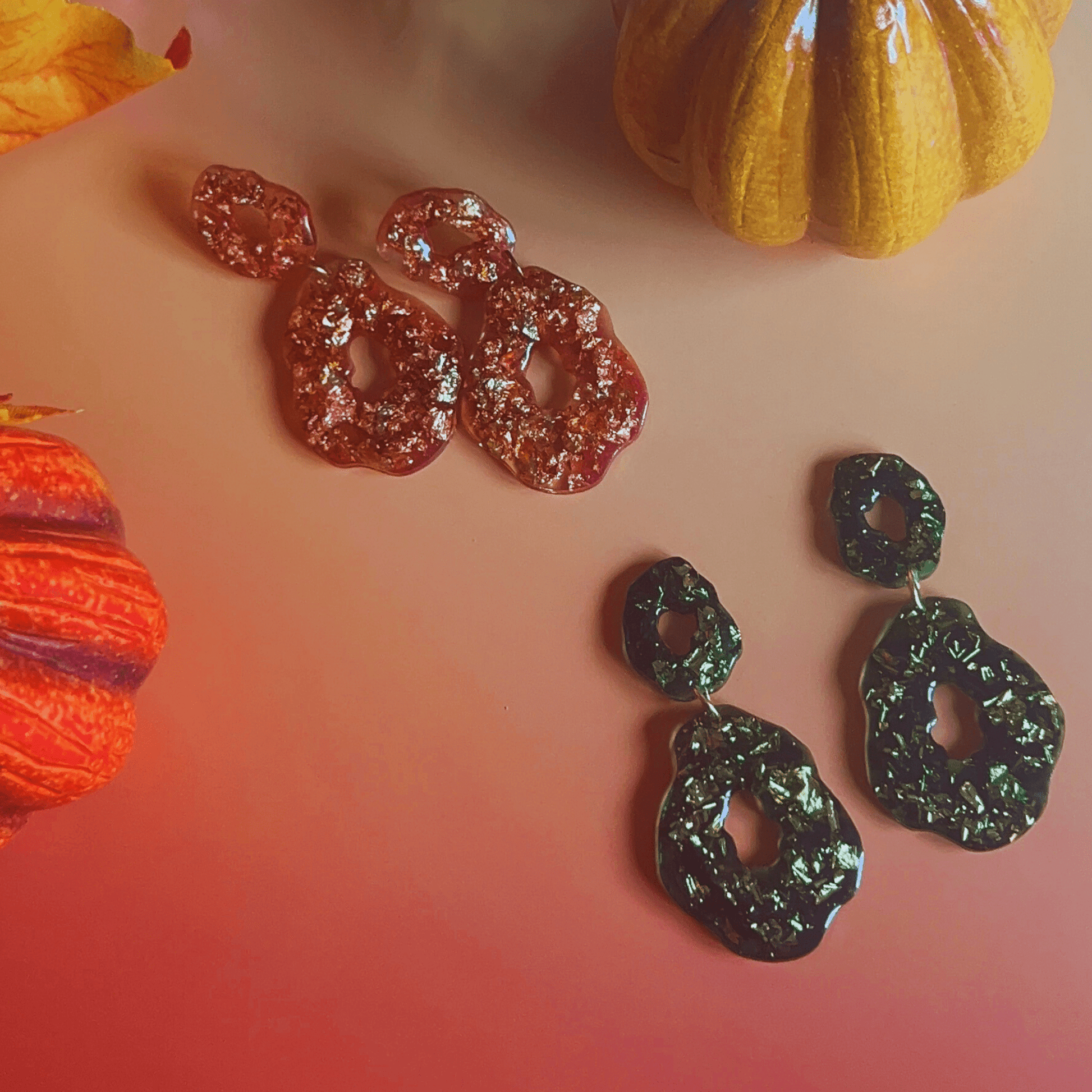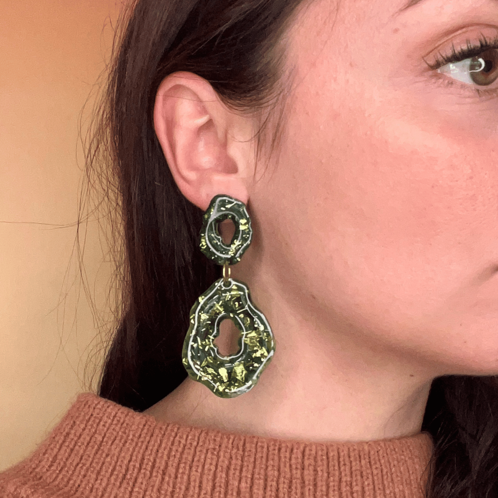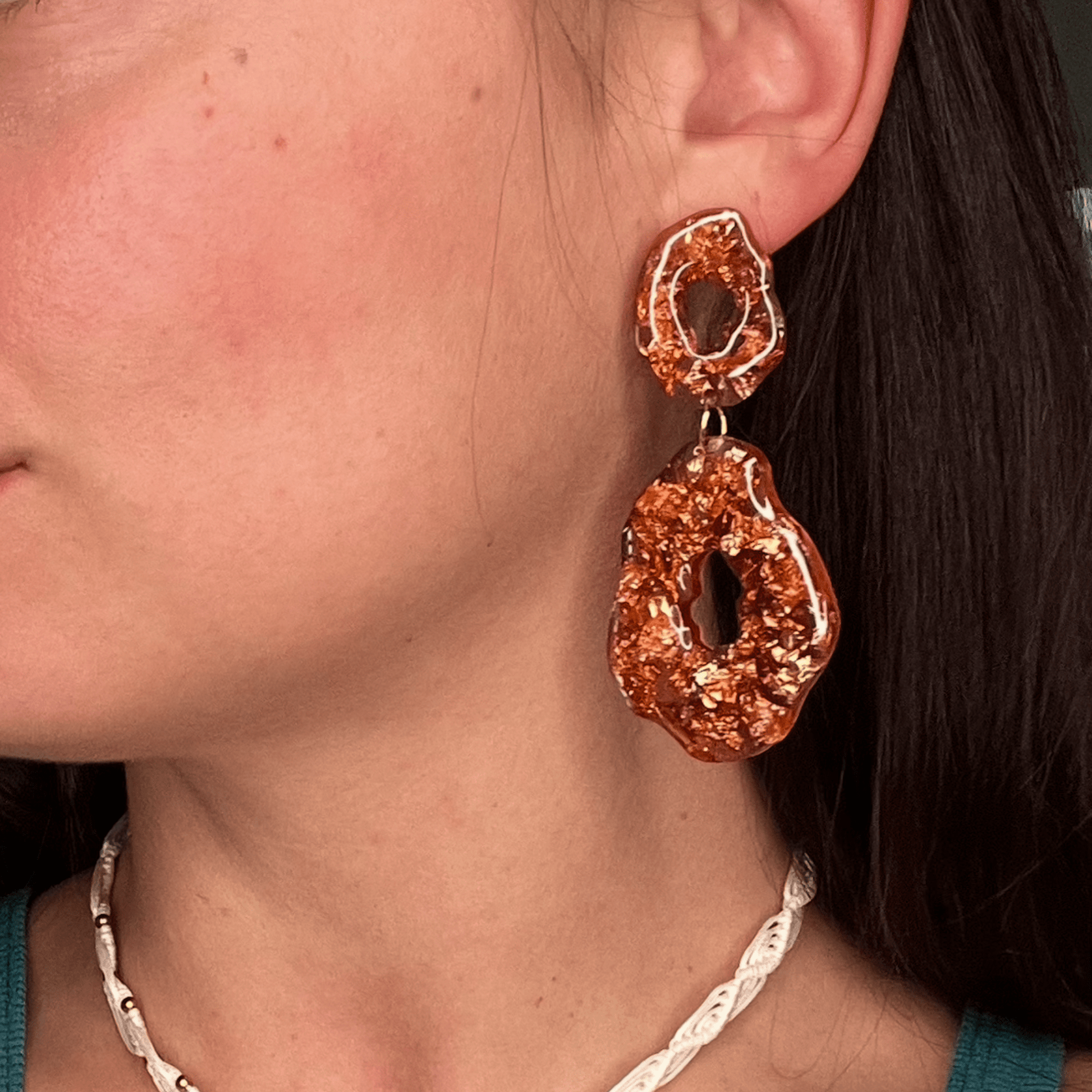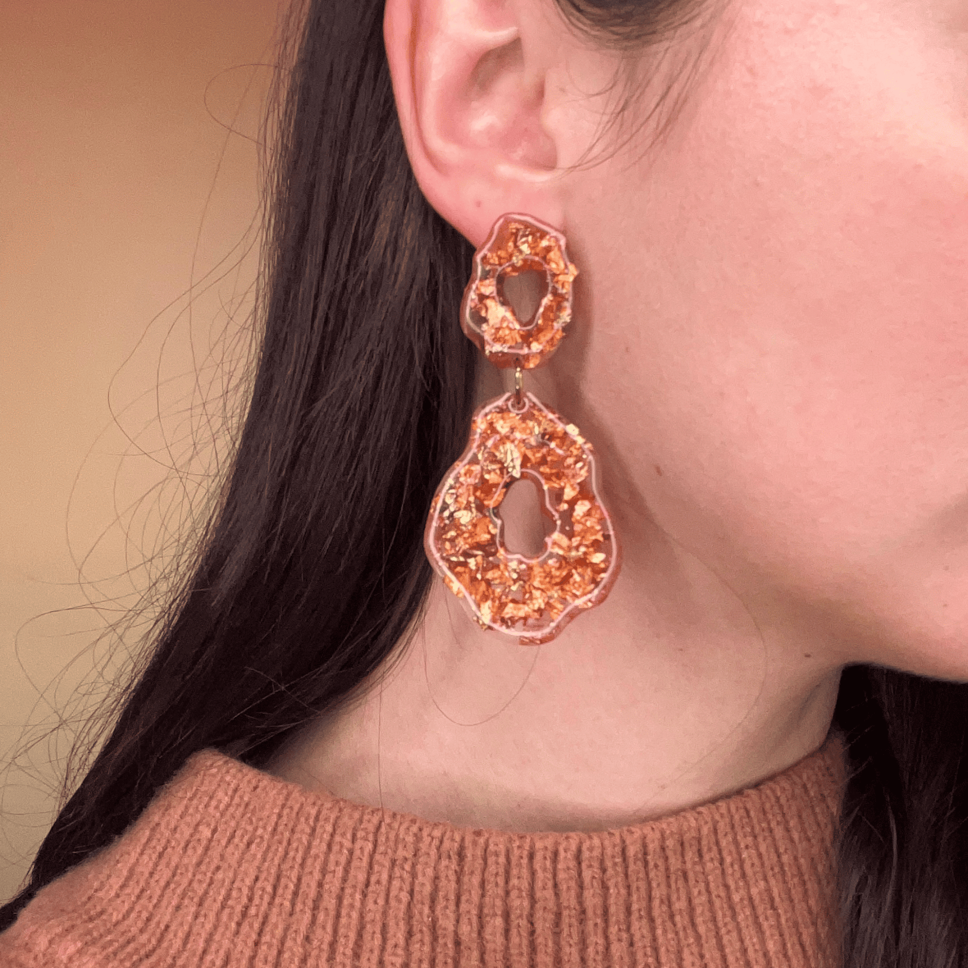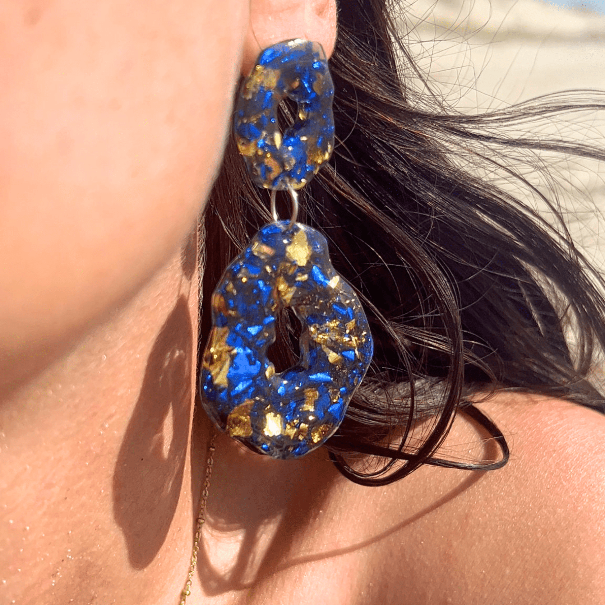 Les boucles Gloria sont des pièces uniques comme sculptées à la main, en résine éclatante façon pierre précieuse fondue, rehaussées de feuilles d’or et de fragments scintillants.