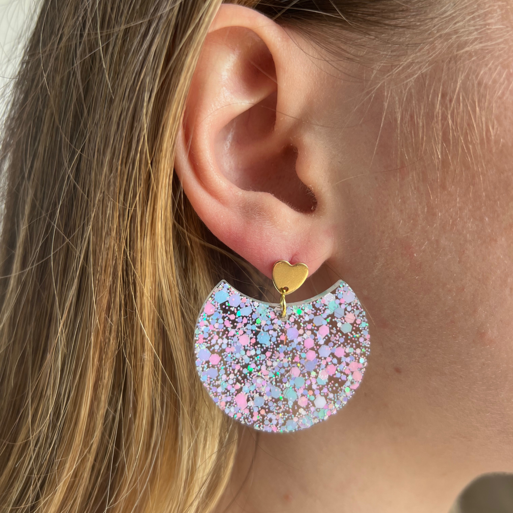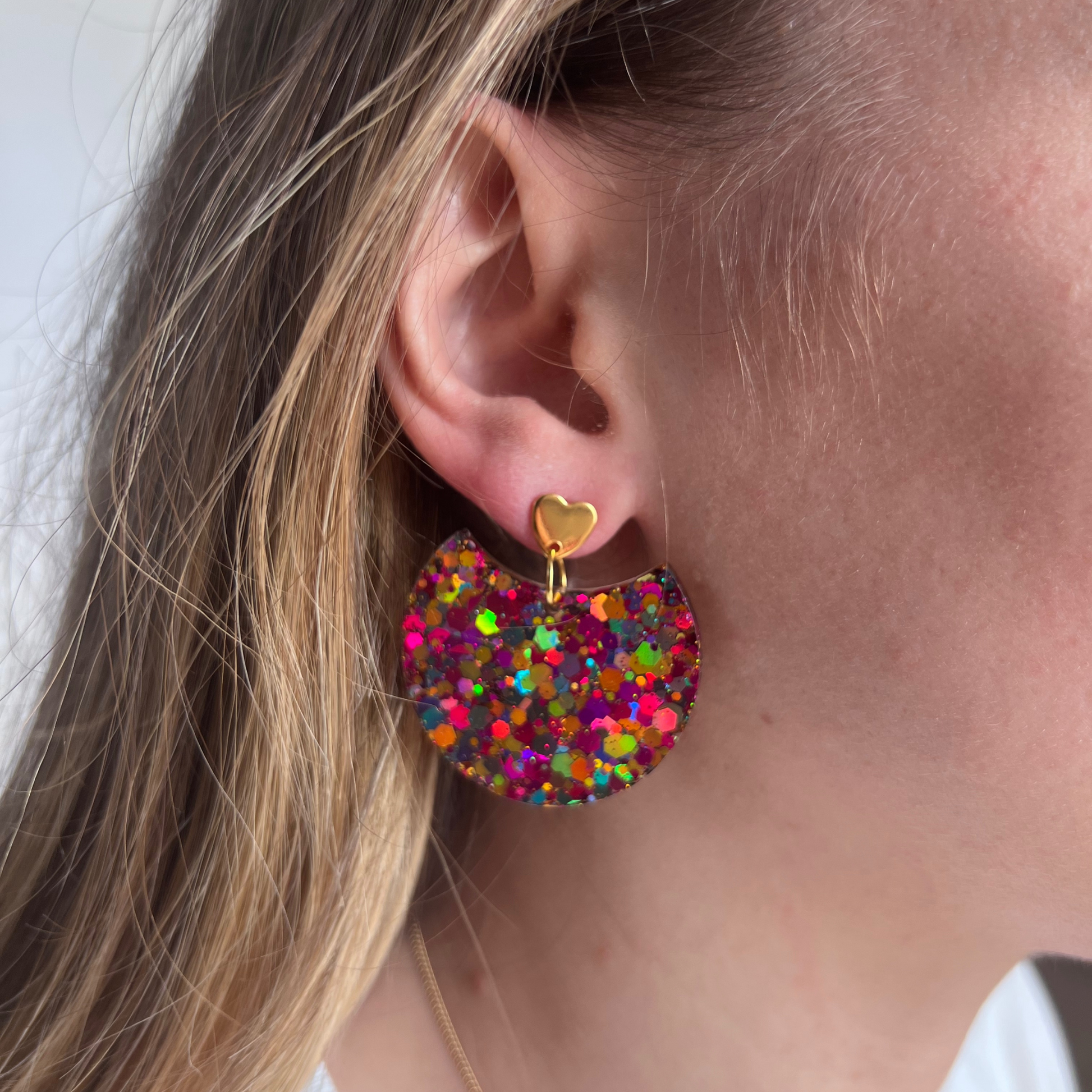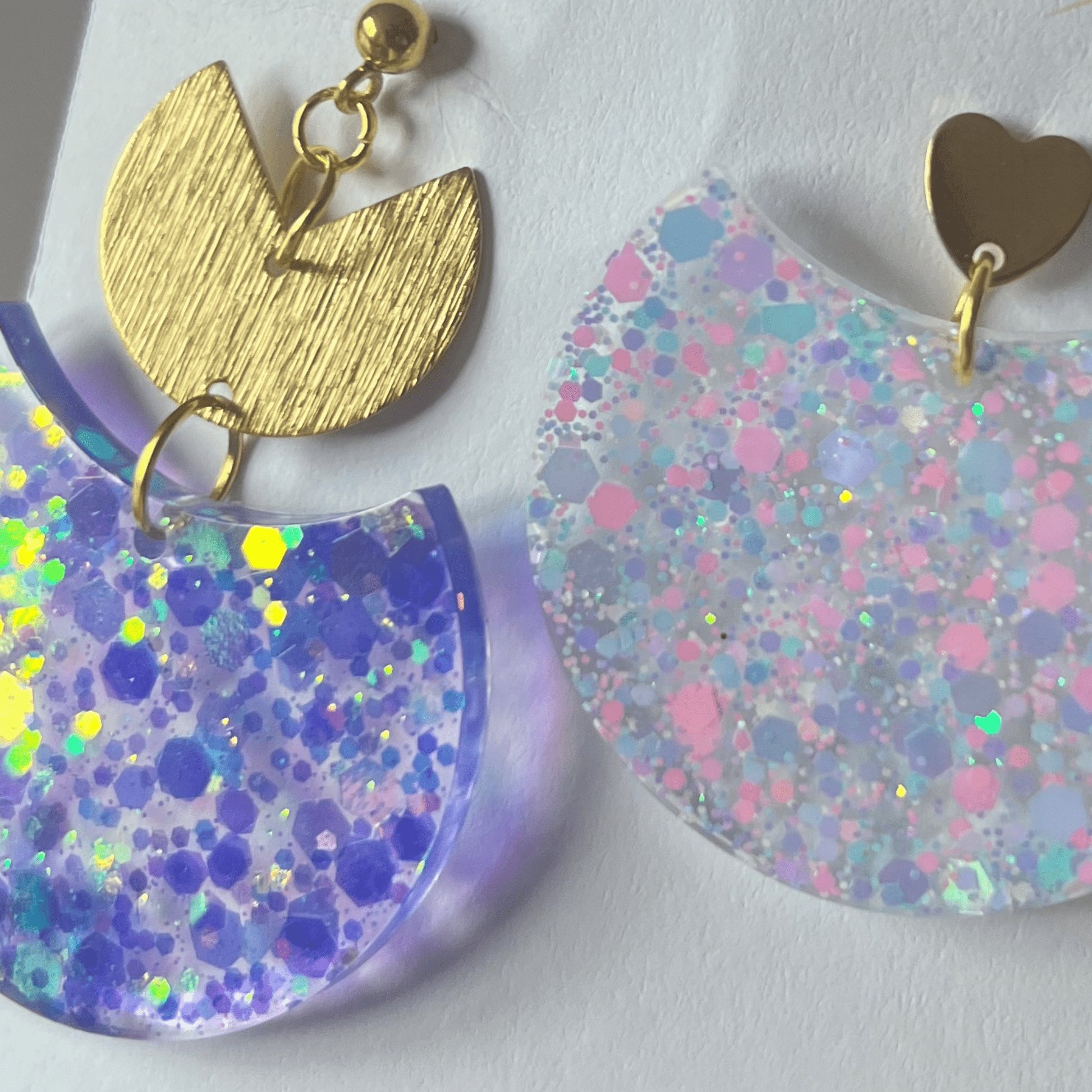 Faites en résine pailletée, ces boucles sont un vrai concentré de bonne humeur et de lumière avec leur petit cœur ou leur assemblage arc en laiton doré. ( au choix)