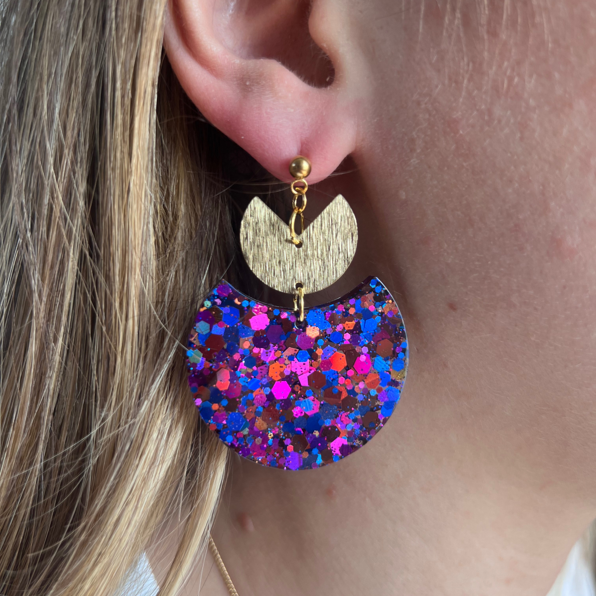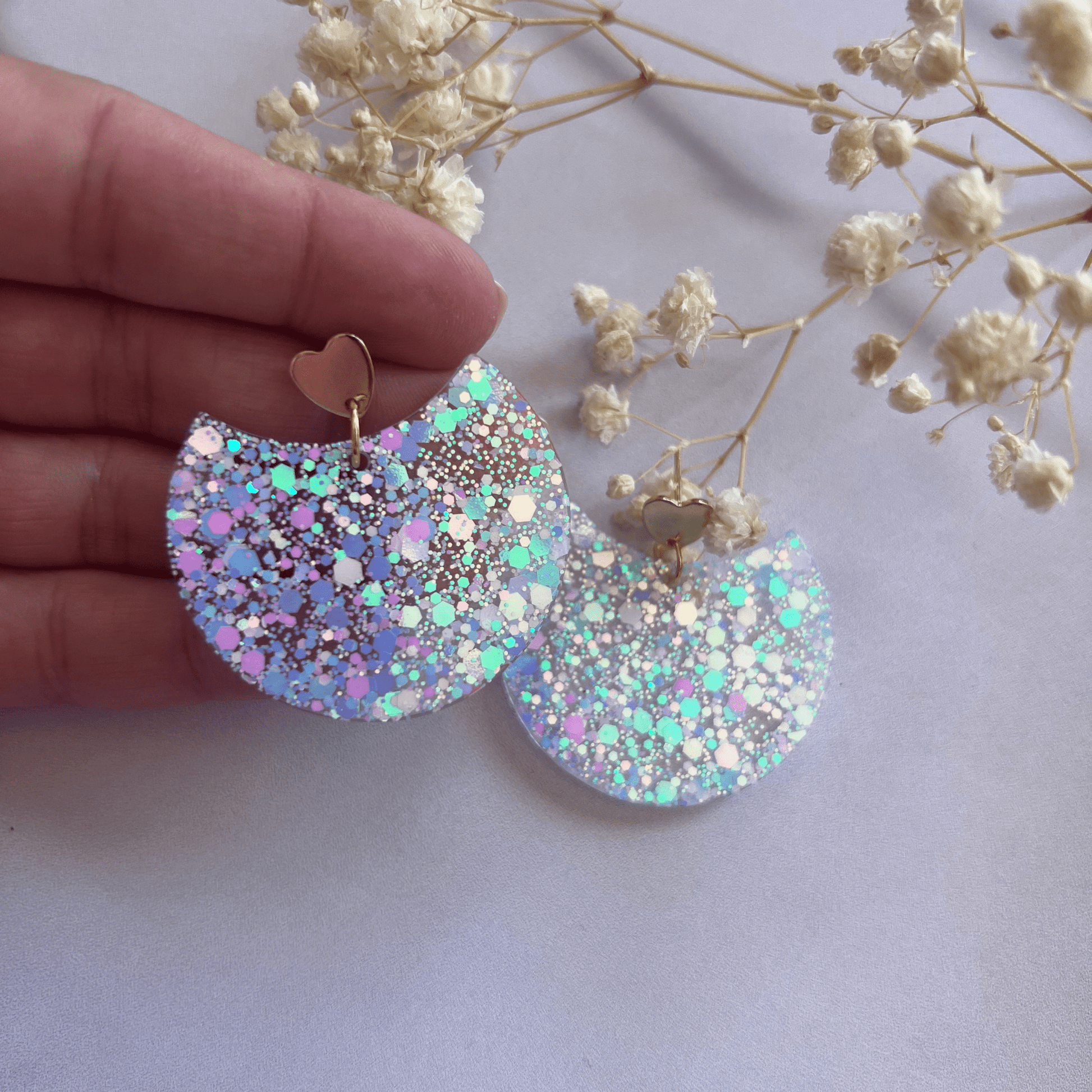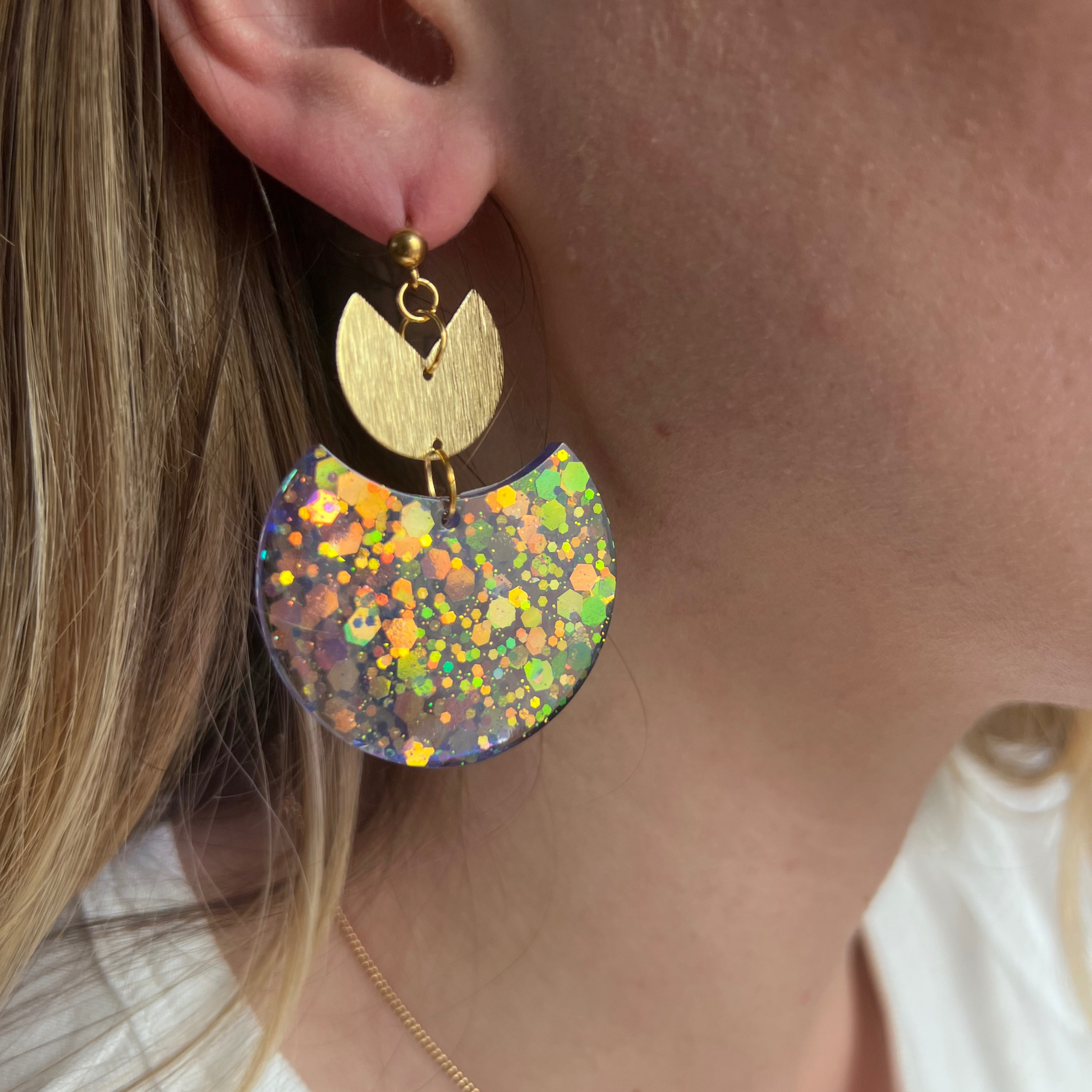 Faites en résine pailletée, ces boucles sont un vrai concentré de bonne humeur et de lumière avec leur petit cœur ou leur assemblage arc en laiton doré. ( au choix)