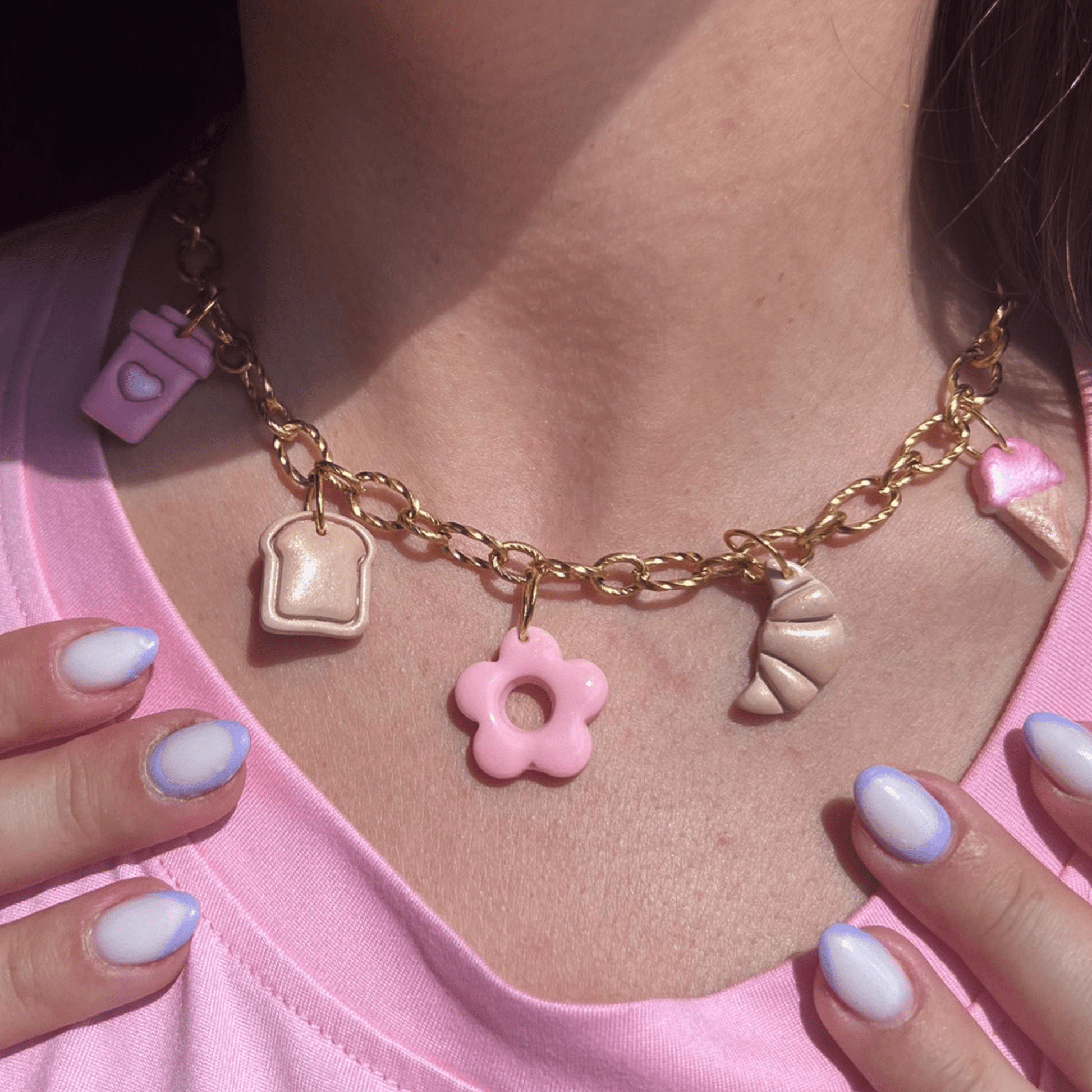 Le modÚle Pinku greedy pour les amatrices gourmandes et fana de rose: composé de charms tout faits main (fleurs, croissant, tartine, glace, mug...) des breloques qui sentent l'été en acier inoxydable, montées sur une chaßne dorée ou argentée, aux couleurs estivales soigneusement choisies pour matcher tes moods ensoleillés.