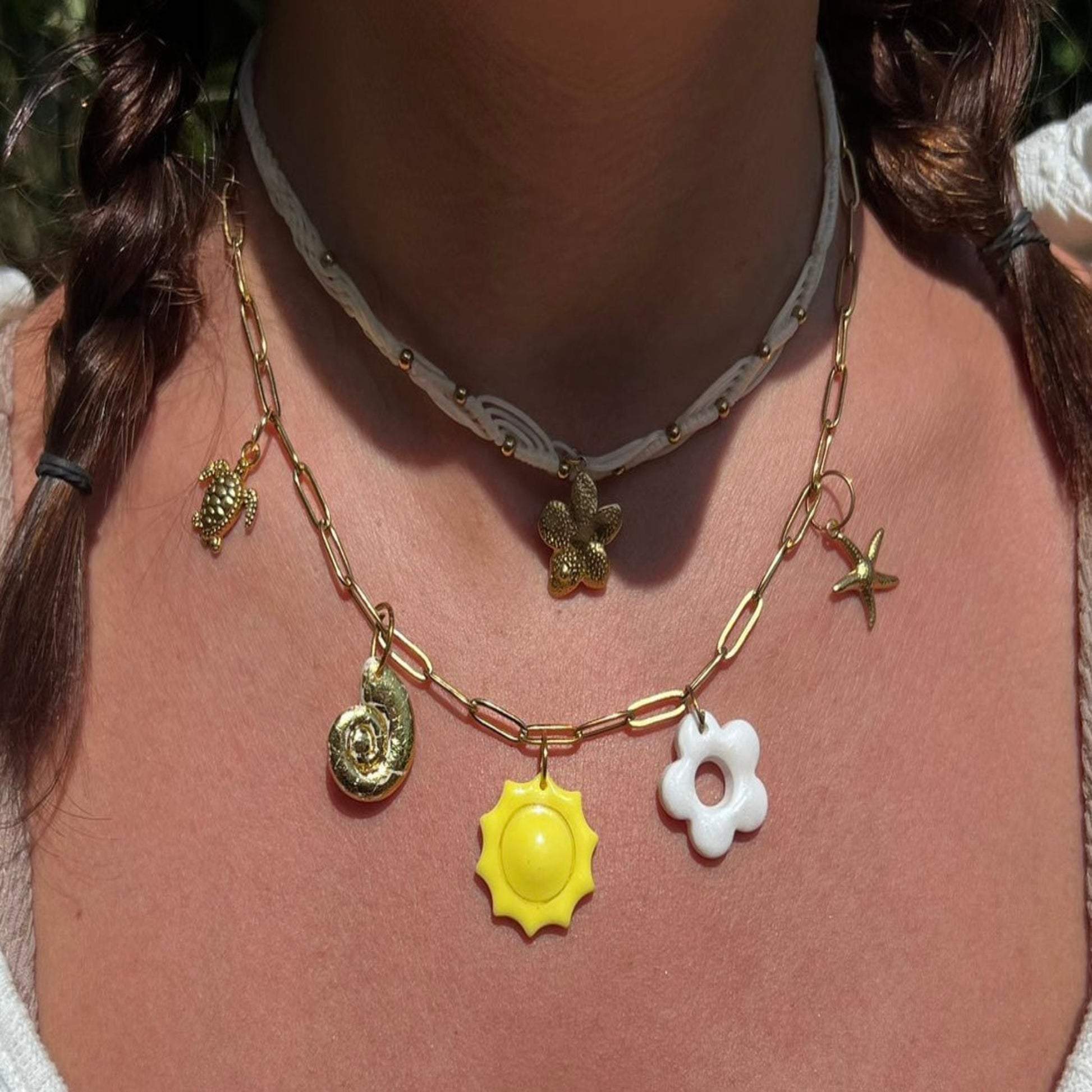 Le modèle sunny est composé de charms faits main (fleur, soleil, étoile de mer, coquillage et tortue) et de breloques coque et étoile de mer montés sur une chaîne dorée, aux couleurs estivales soigneusement choisies pour matcher tes moods ensoleillés.