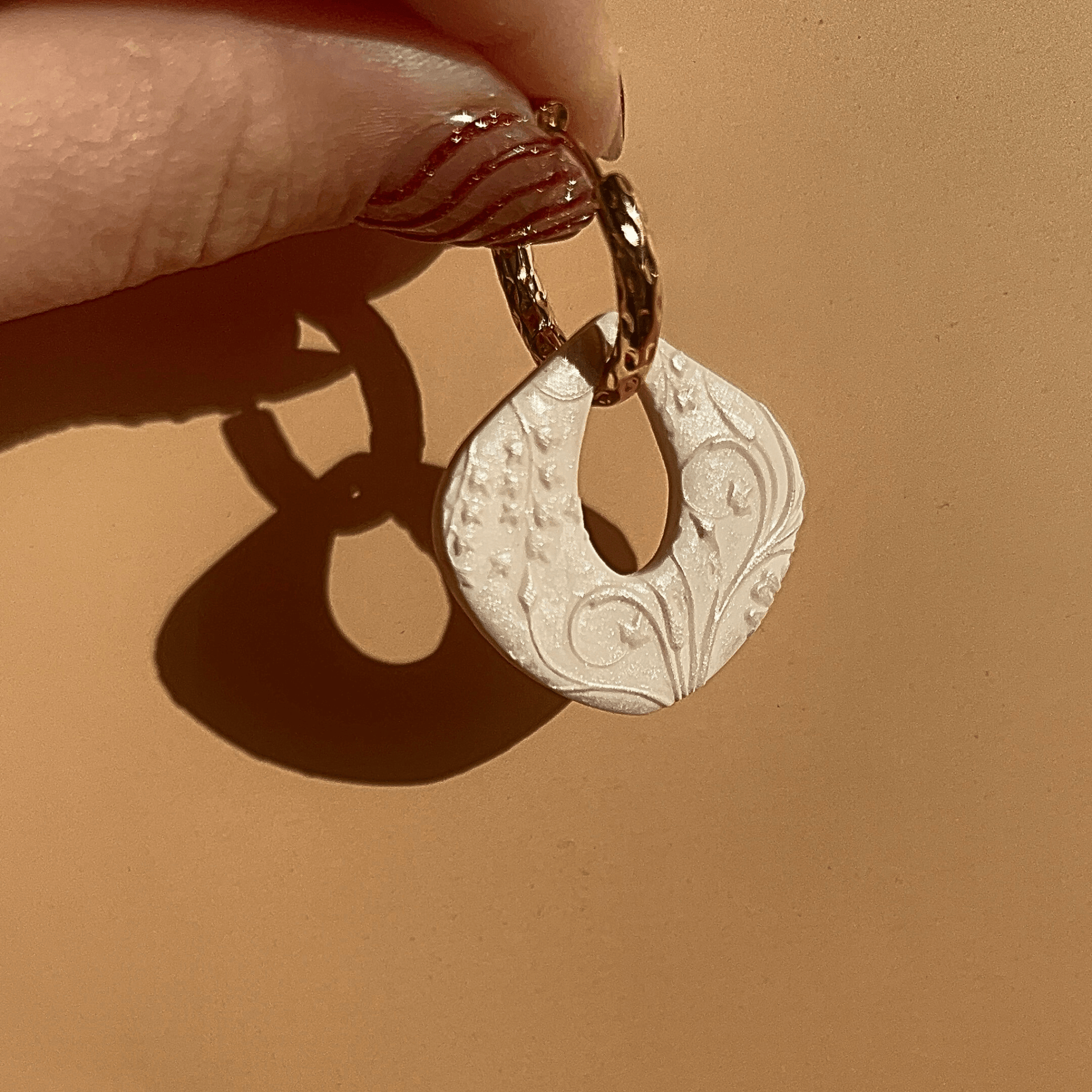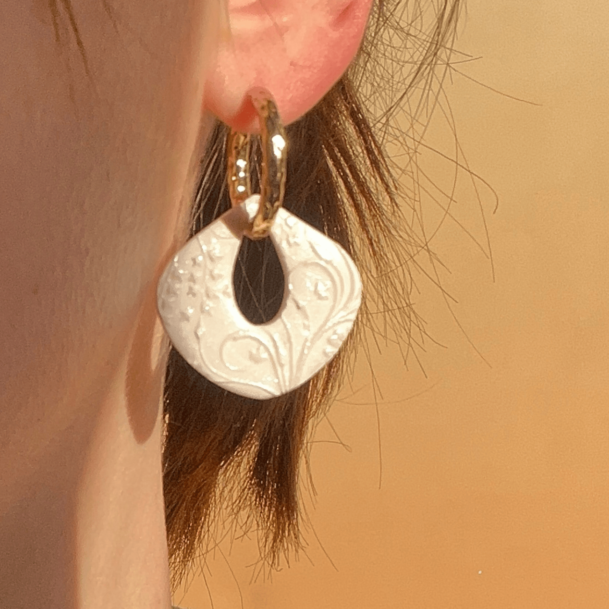 Laissez-vous séduire par la délicatesse des boucles d'oreilles Jasmine , aux jolis textures de fleurs sur fond blanc nacre. Leur forme goutte me fait penser aux milles et une nuit.