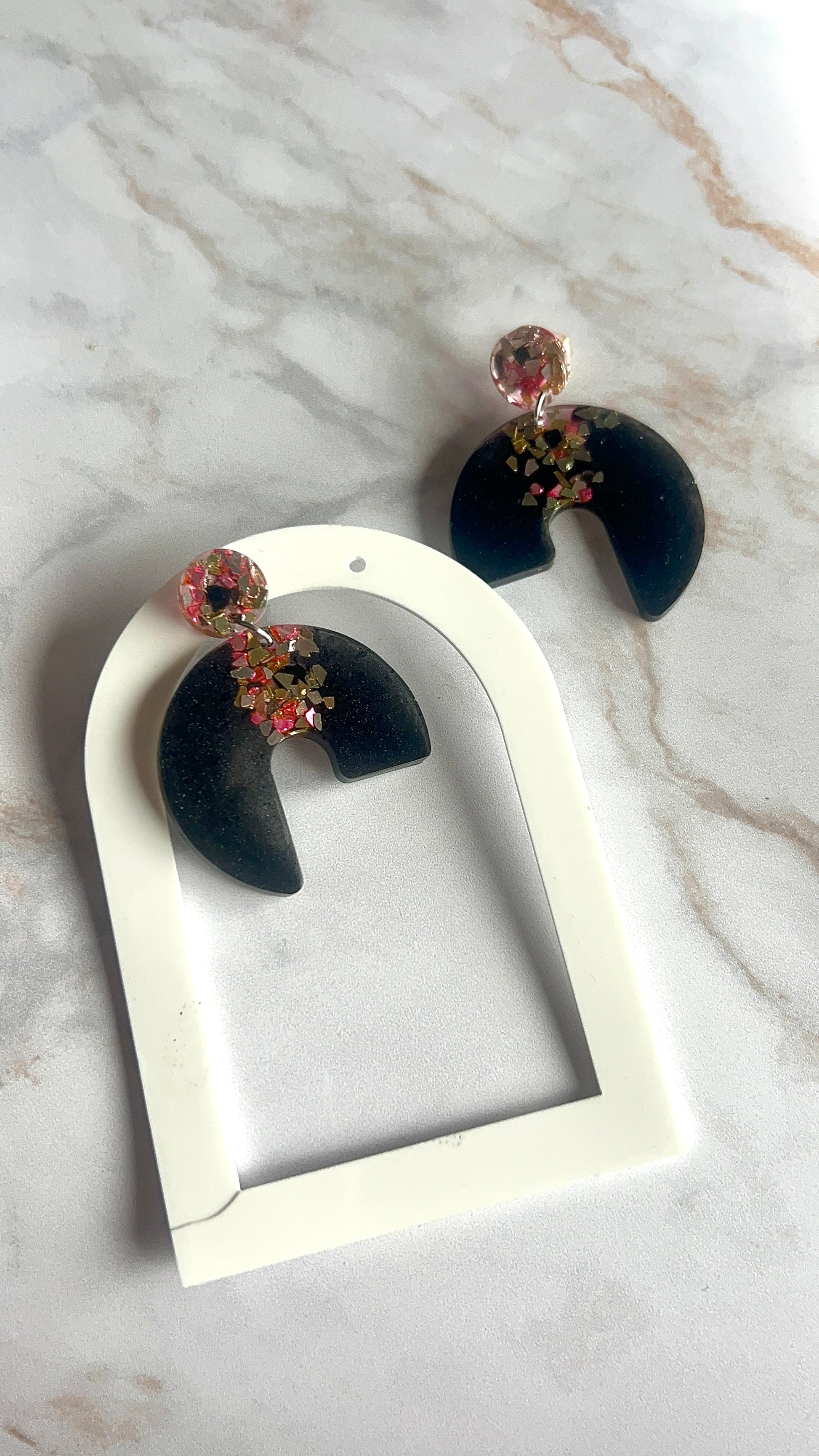 Un noir profond, des éclats roses et dorés façon petites gemmes, et cette forme moderne asymétrique qui attire l’œil tout en restant chic.