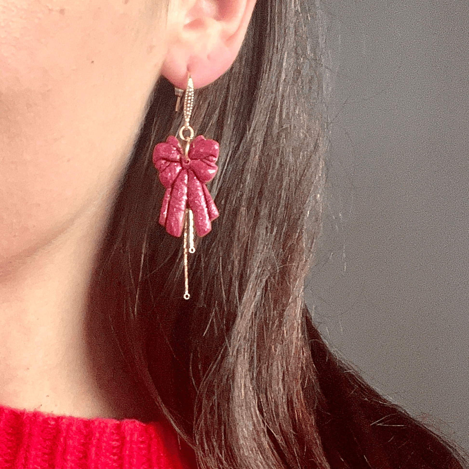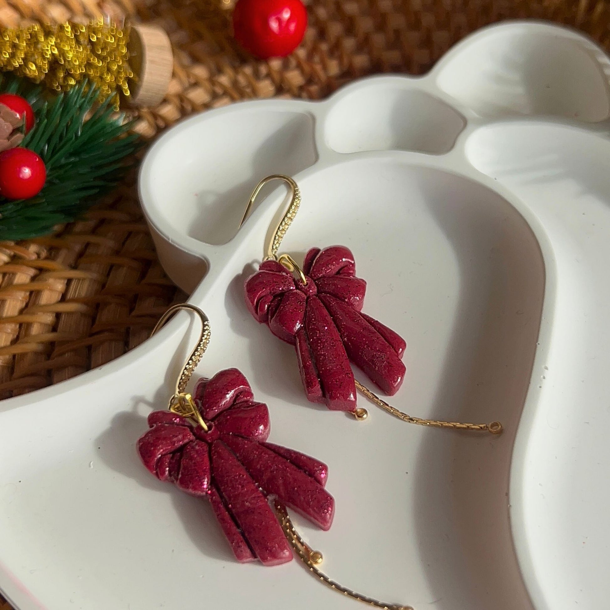 Un joli nœud robe lie-de-vin pailleté et une touche dorée pendante qui apportent ce petit air chic et féminin.