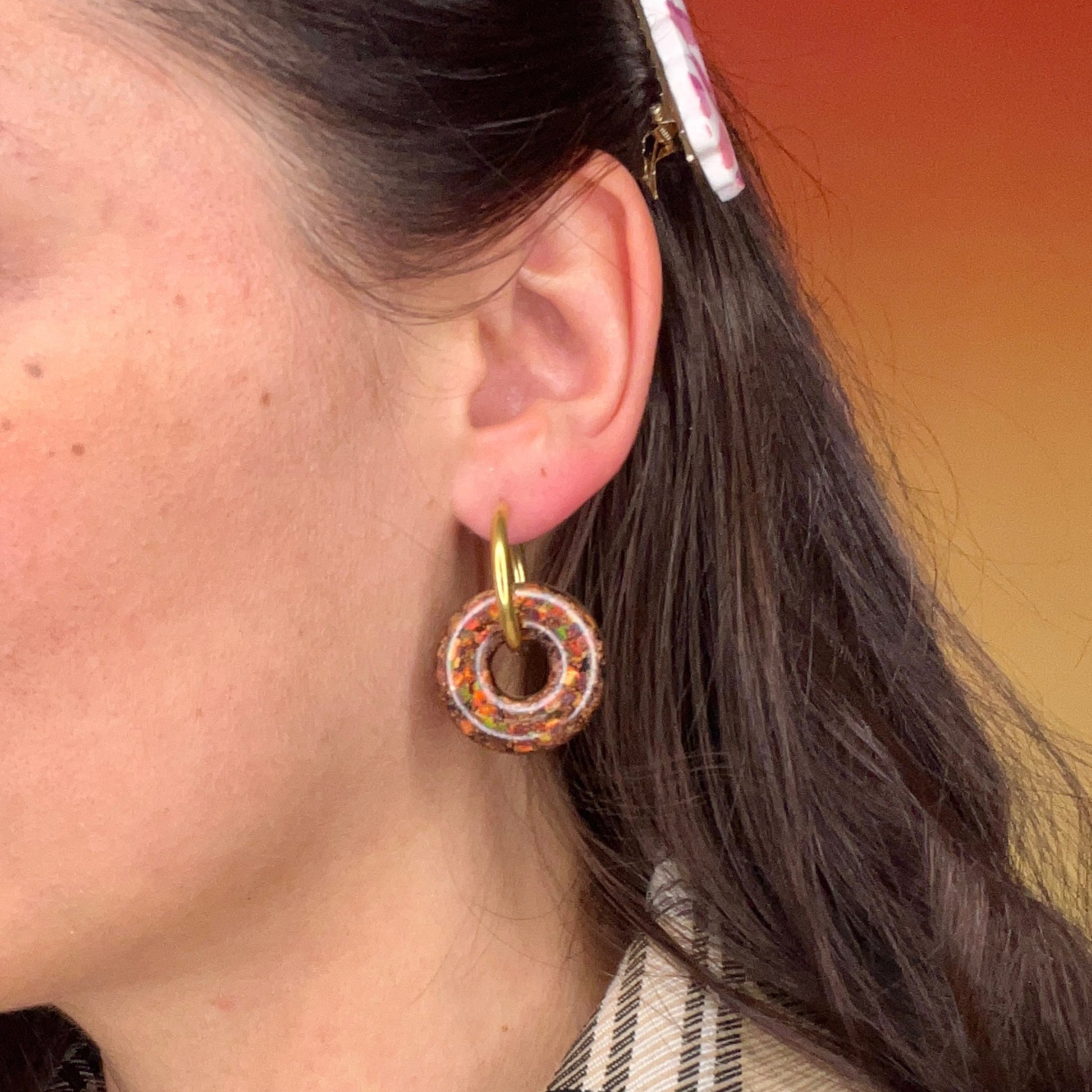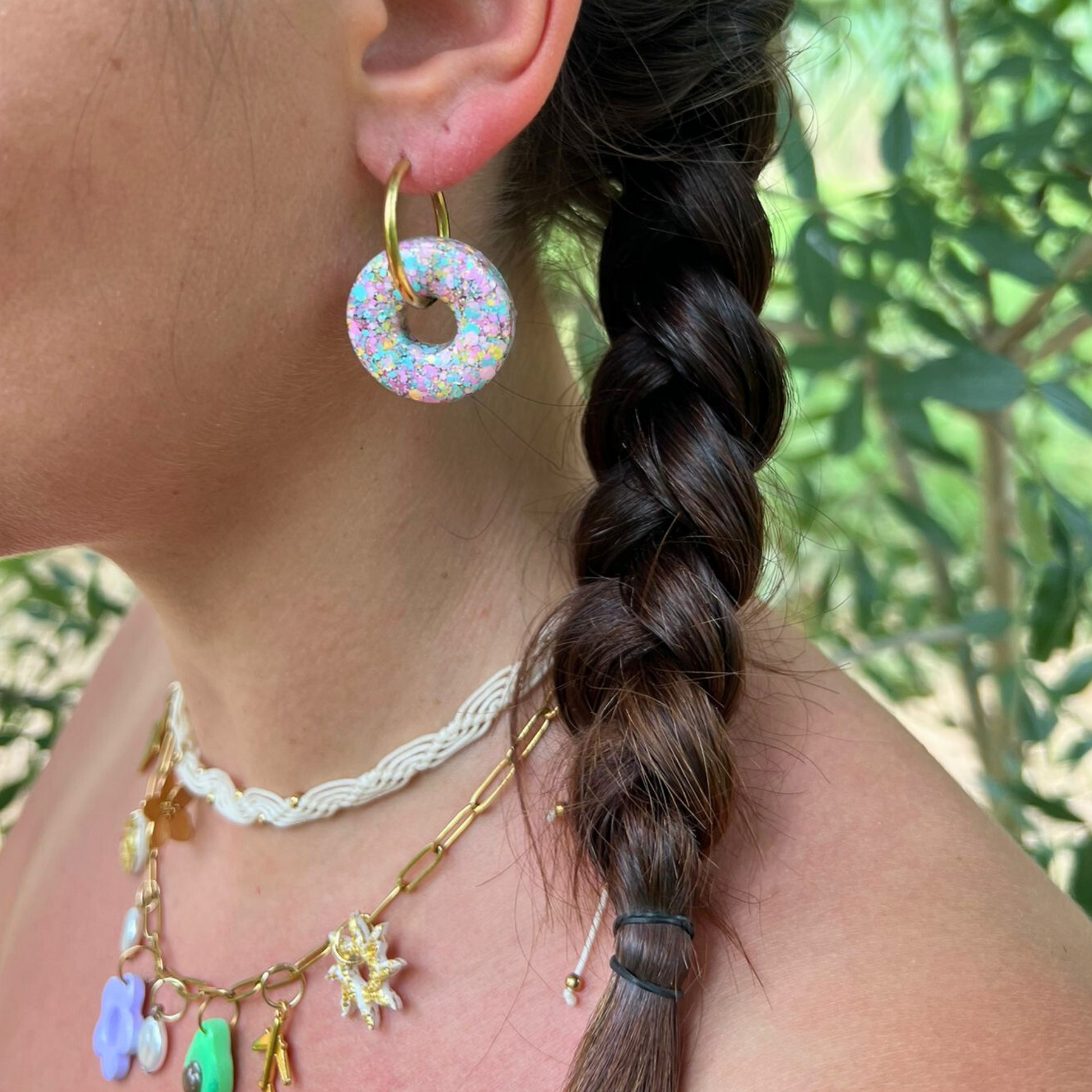 Gourmandes et colorées, ces pétilles en forme de donuts sont à croquer (des yeux !). Parfaites à clipser sur vos créoles pour un style régressif, playful et plein de peps 🧁