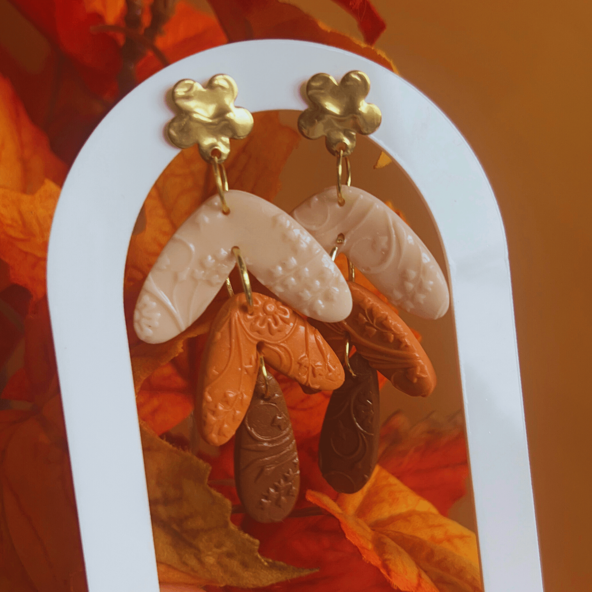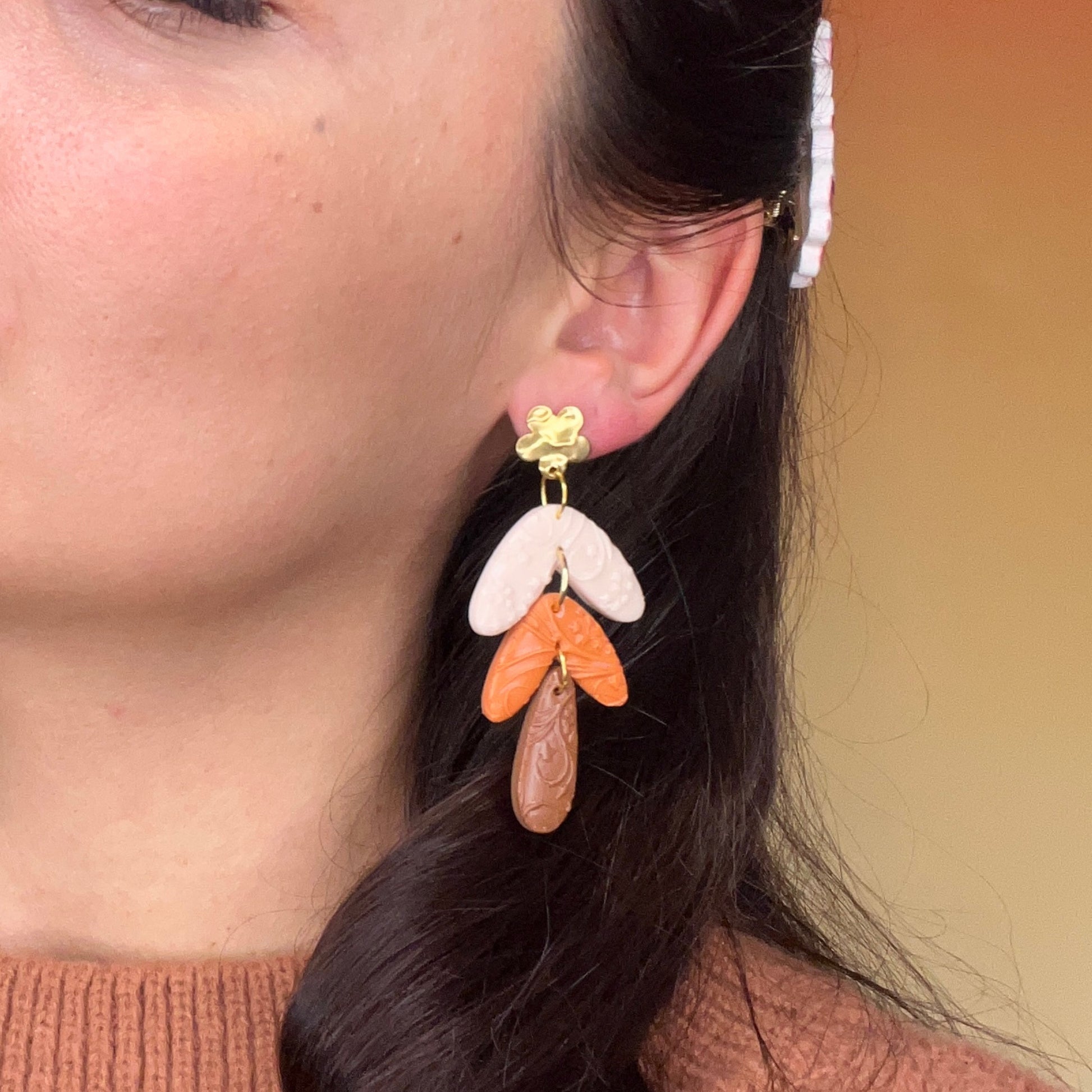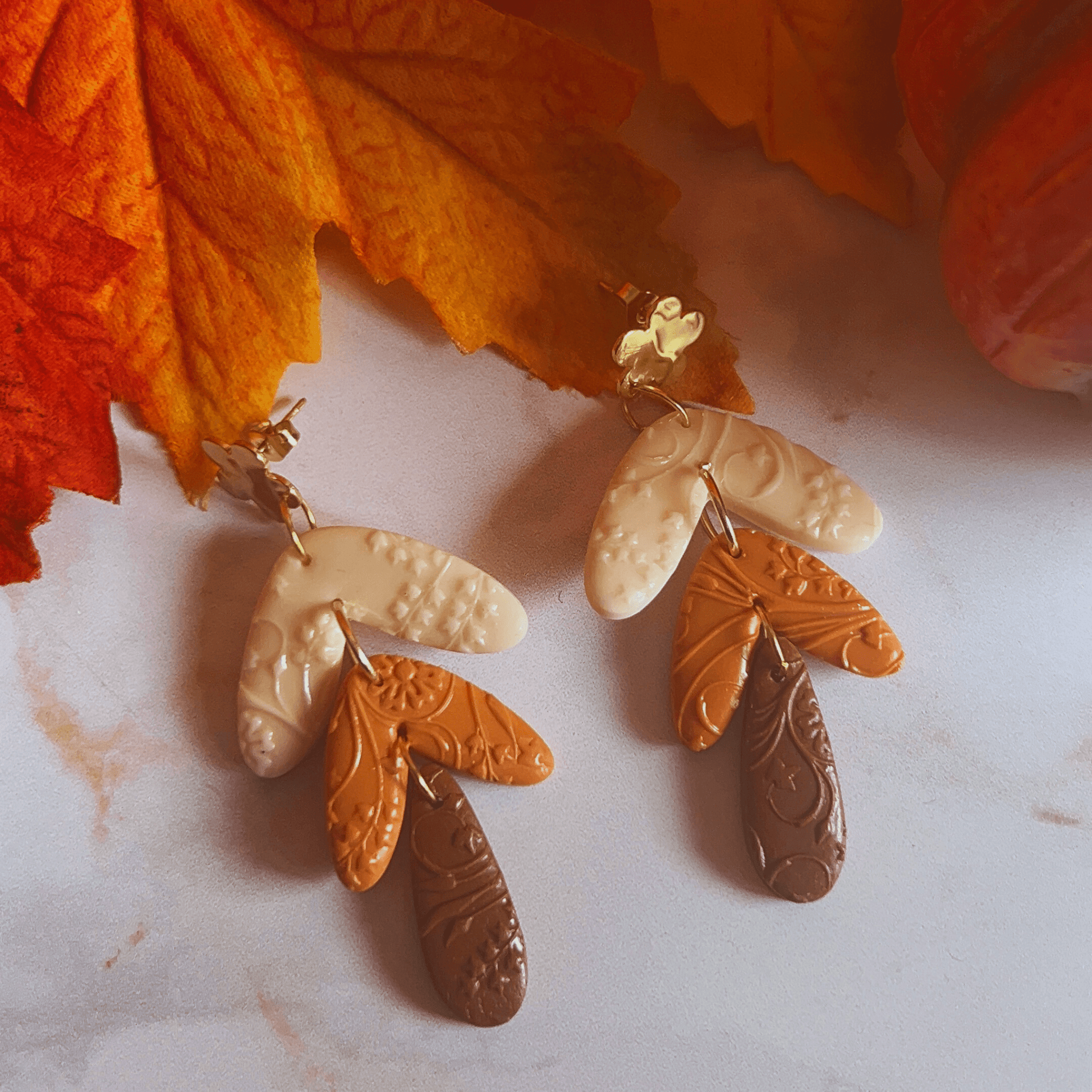 Élégantes et délicates, les Sépianes sont comme des feuilles tombantes aux dégradés de sépia, en texture florale. Les attaches fleurs sont disponibles en doré ou argenté.
