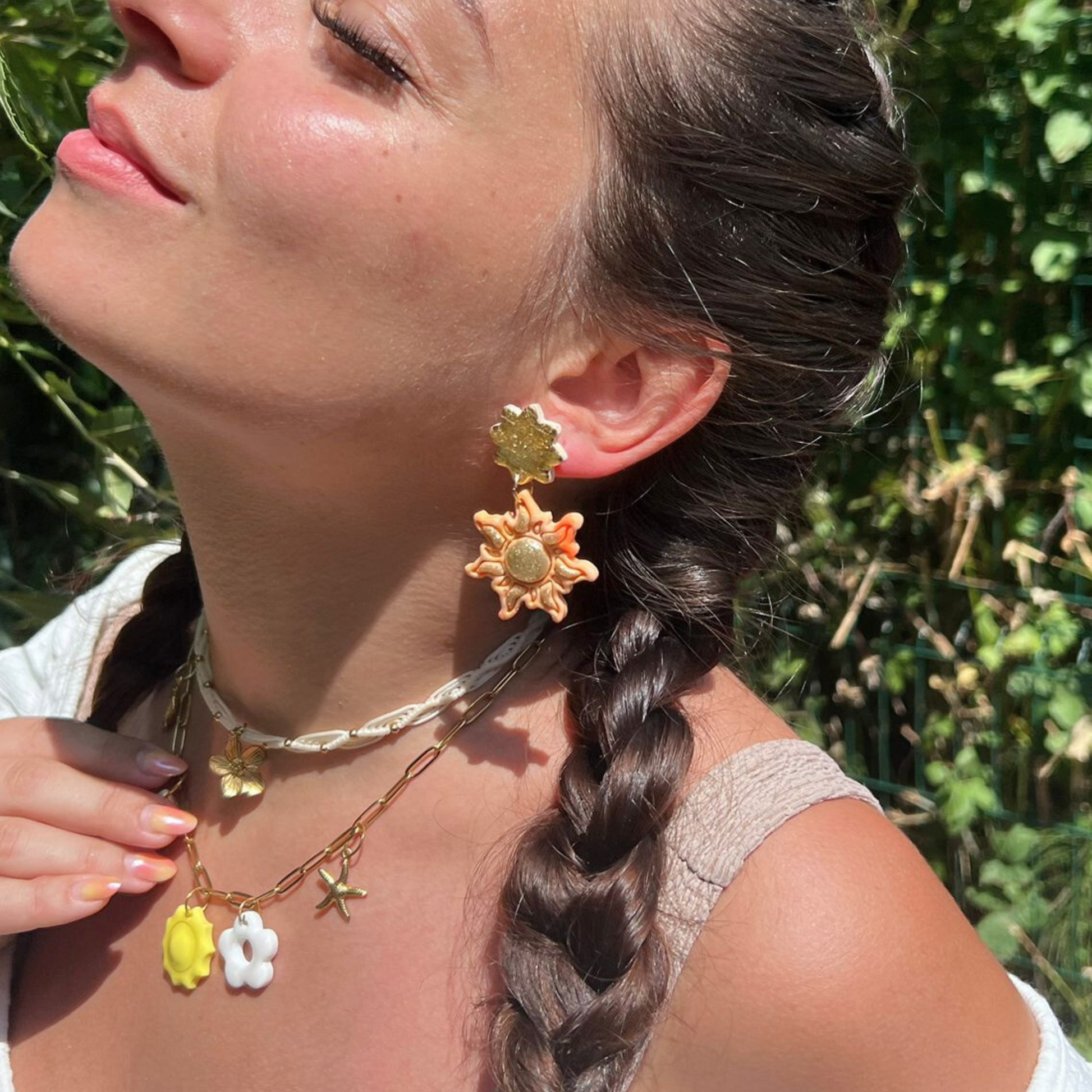 Un gros soleil texturé, aux nuances orangées et fluos, réchauffe ton look.